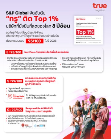 S&P Global จัดอันดับ “ทรู” ติด Top 1% บริษัทที่ยั่งยืนที่สุดของโลก 8 ปีซ้อน ย้ำบทบาทเทเลคอม-เทคที่ขับเคลื่อนด้วย AI-First เพื่อสร้างคุณค่าให้ลูกค้าและสังคมอย่างยั่งยืน