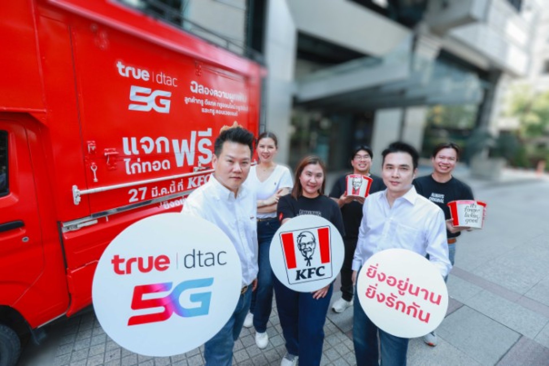 เพราะทุกความผูกพันมีความหมาย... ทรู คอร์ปอเรชั่น โดยคุณโอลิเวอร์ กิตติพงษ์ วีระเตชะ หัวหน้าคณะผู้บริหารด้านแบรนด์และการสื่อสาร พร้อมด้วย คุณสรรค์พิจิตร เอี่ยมชีรางกูร หัวหน้าสายงานบริหารจัดการลูกค้าสัมพันธ์และสิทธิประโยชน์ และคุณโรจน์ เดโชดมพันธ์ หัวหน้าสายงานโมบายล์ โพสต์เพย์ เดินหน้าอัพความสุข ฉลองความผูกพันให้ลูกค้าคนสำคัญ จับมือกับ KFC โดย คุณเจริญชัย บำรุงวงศ์ทอง ประธานเจ้าหน้าที่ฝ่ายการตลาด บริษัท เรสเทอรองตส์ ดีเวลลอปเม้นท์ จำกัด พร้อมคุณกิรณา ฤกษ์บางพลัด ผู้จัดการอาวุโส - KFC บริษัท เดอะ คิวเอสอาร์ ออฟ เอเชีย จำกัด และคุณชยธร อาทรสมบัติ ผู้อำนวยการฝ่ายการตลาดเคเอฟซี บริษัท เซ็นทรัล เรสตอรองส์ กรุ๊ป จำกัด เดินหน้าอัพความสุข ฉลองความผูกพันให้ลูกค้าคนสำคัญ ส่งความสุขคำโตในแคมเปญ “อิ่มกับทรู ยิ่งอยู่นาน ยิ่งรักกัน ฉลองความผูกพัน” ซึ่งสานต่อความสำเร็จจากแคมเปญ “ยิ่งอยู่นาน…ยิ่งรักกัน” มอบประสบการณ์สุดพิเศษเพื่อขอบคุณลูกค้าที่อยู่เคียงข้างกันมาอย่างยาวนาน ทั้งลูกค้าทรู 5G, ดีแทค 5G, ทรูออนไลน์, ทรูวิชั่นส์ และทรู คอนเวอร์เจนซ์ ให้ลูกค้าคนสำคัญทุกเพศทุกวัยได้อิ่มเอม และแบ่งปันช่วงเวลาดีๆ รับสิทธิ์ ฟรี! ไก่ทอดเคเอฟซีรวมกว่า 400,000 ชิ้นทั่วประเทศ ตรวจสอบสิทธิ์ได้ตั้งแต่วันที่ 19 – 25 มี.ค. 69 ผ่านทรูแอป หรือเว็บไซต์ https://ss.true.th/s/AOUKFC โดยเลือกรับความสุขได้เองใน 2 รูปแบบ