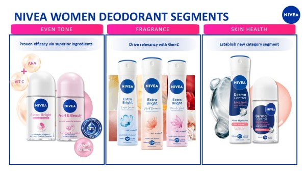 ในปีที่ผ่านมา นีเวียได้เปิดตัวนวัตกรรมอย่างต่อเนื่อง ครอบคลุมทั้งผลิตภัณฑ์ระงับกลิ่นกาย Derma Control เน้นการบำรุงผิวใต้วงแขน นับเป็นการเปิดเซกเมนต์ใหม่ในตลาดดีโอ ผลิตภัณฑ์บำรุงผิวกายที่อัปเกรดสูตรด้วยส่วนผสมสกินแคร์ เช่น Gluta และ Niacinamide รวมถึง NIVEA Skin Glow Serum ที่ผสาน Thiamidol เพื่อการดูแลปัญหาผิวอย่างตรงจุด โดยหมวด Face Care ถือเป็นหนึ่งในหมวดที่เติบโตเร็วที่สุดของตลาด และเป็นหนึ่งใน Strategic Growth Engine ของนีเวีย ปัจจุบัน Face Care มีสัดส่วนประมาณ 83% ของตลาดสกินแคร์ในประเทศไทย และเติบโต 9.5% ในปี 2025 (Euromonitor) สะท้อนให้เห็นถึงความต้องการของผู้บริโภคที่ให้ความสำคัญกับการดูแลผิวหน้า โดยเฉพาะในด้าน Brightening, Anti-Aging และ Hydration โดย ผลิตภัณฑ์ NIVEA Skin Glow Serum ได้รับการตอบรับอย่างดีจากผู้บริโภค และสามารถก้าวขึ้นเป็นอันดับ 1 ในตลาดเซรั่มทั้งแบบขวดและแบบซองได้อย่างรวดเร็ว