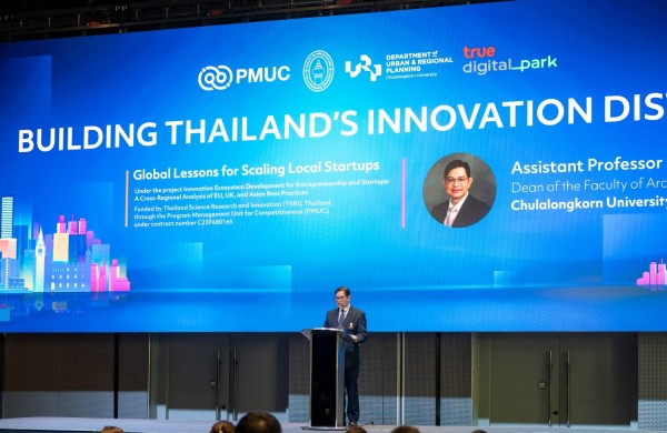 จุฬาลงกรณ์มหาวิทยาลัย โดย คณะสถาปัตยกรรมศาสตร์ และ ศูนย์บริการวิชาการแห่งจุฬาลงกรณ์มหาวิทยาลัย ลงนามบันทึกข้อตกลงความร่วมมือ กับ ทรู ดิจิทัล พาร์ค ศูนย์กลางเทคและสตาร์ทอัพที่ใหญ่ที่สุดในเอเชียตะวันออกเฉียงใต้ ประกาศผนึกพลังขับเคลื่อนโครงการ “การพัฒนาย่านนวัตกรรมสนับสนุนผู้ประกอบการสตาร์ทอัพ ผ่านการเรียนรู้โมเดลระดับโลก” ดึงศักยภาพด้านงานวิจัยโดยเฉพาะในระดับมหาวิทยาลัย เชื่อมโยงเครือข่ายผู้ประกอบการ นักลงทุน และองค์กรธุรกิจทั้งในและต่างประเทศภายใต้ระบบนิเวศสตาร์ทอัพที่สมบูรณ์แบบครบวงจร เสริมด้วยองค์ความรู้ระดับสากลจากพันธมิตรองค์กรชั้นนำใน 3 ประเทศ คือ เนเธอร์แลนด์ สหราชอาณาจักร และ สิงคโปร์ เปิดฉากทัศน์ใหม่ในการแลกเปลี่ยนประสบการณ์และความเชี่ยวชาญ การพัฒนาโครงการร่วม และการเชื่อมโยงตลาดและแหล่งทุนระดับภูมิภาคและระดับโลก มุ่งศึกษา 3 เทคโนโลยียุทธศาสตร์ ได้แก่ อาหารแห่งอนาคต (Future Food) สุขภาพ (Health Tech) และ สิ่งแวดล้อม (Green Innovation) ตั้งเป้าเปลี่ยนงานวิจัยเชิงลึก สู่การสร้างพื้นที่เศรษฐกิจนวัตกรรมที่จับต้องได้