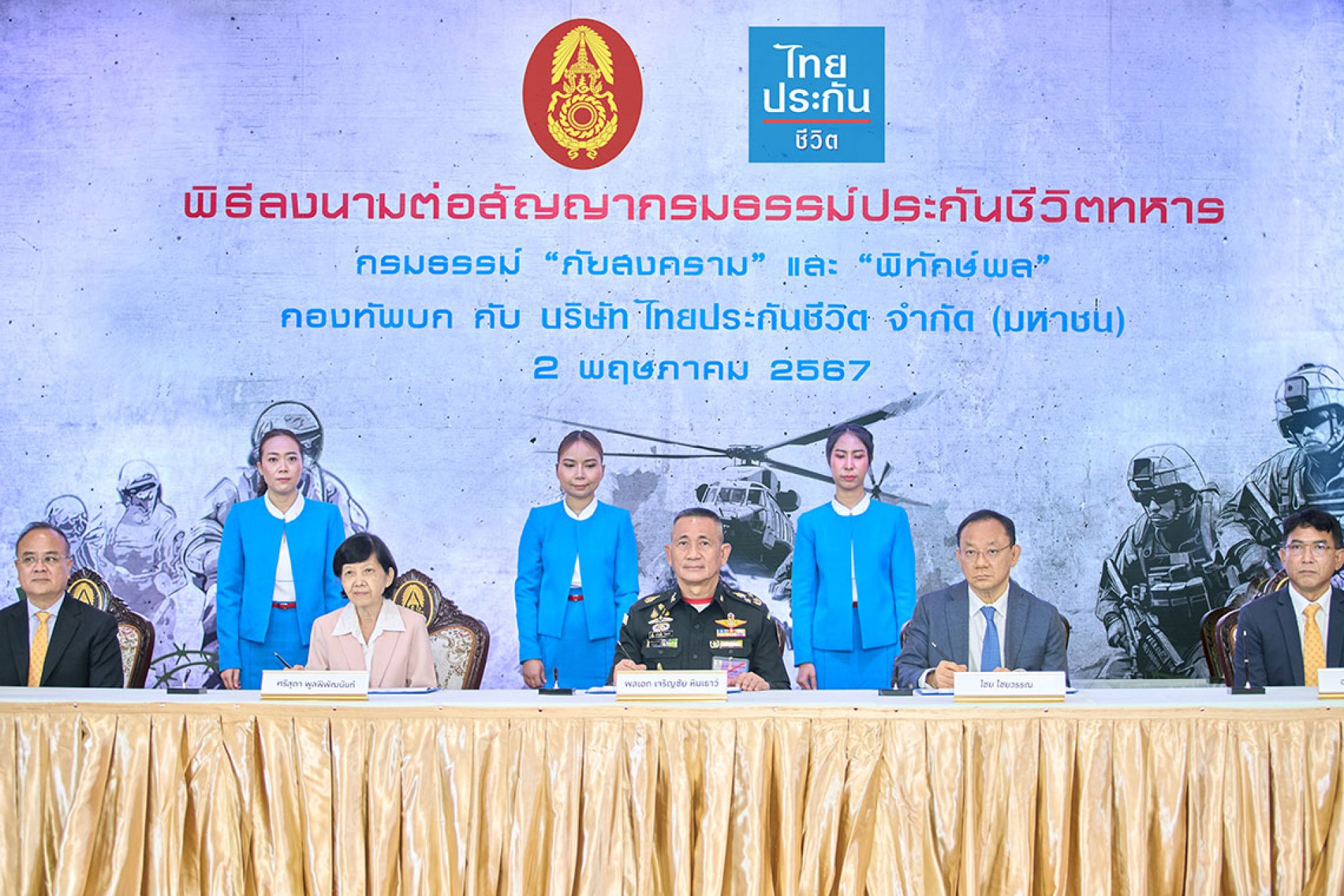 พลเอก เจริญชัย หินเธาว์ ผู้บัญชาการทหารบก พร้อมด้วย นายไชย ไชยวรรณ กรรมการและประธานเจ้าหน้าที่บริหาร และนางศรีสุดา พูลพิพัฒนันท์ กรรมการ บริษัท ไทยประกันชีวิต จำกัด (มหาชน) ร่วมลงนามต่อสัญญากรมธรรม์ประกันชีวิตทหาร ประจำปี 2567 เพื่อมอบหลักประกันแก่กำลังพลกองทัพบกทุกชั้นยศ ภายใต้กรมธรรม์แบบ ภัยสงคราม และแบบ พิทักษ์พล ซึ่งคุ้มครองทั้งกรณีปฏิบัติภารกิจภาคสนามและยามปกติ โดยได้รับเกียรติจาก นายชูฉัตร ประมูลผล เลขาธิการ และนายอาภากร ปานเลิศ รองเลขาธิการด้านกำกับ คณะกรรมการกำกับและส่งเสริมการประกอบธุรกิจประกันภัย (คปภ.) ร่วมเป็นสักขีพยาน ณ กองบัญชาการกองทัพบก