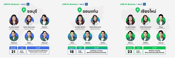 ภายในงาน ผู้ประกอบการจะได้พบกับวิทยากรชั้นนำมากมาย ทั้งผู้เชี่ยวชาญจาก LINE และ สสว. มาร่วมแบ่งปันเทรนด์ สภาพการณ์ตลาดที่น่าสนใจ พร้อมกองทัพดิจิทัลกูรู LINE Certified Coach กับเทคนิคความรู้ การใช้งานโซลูชั่น เครื่องมือต่างๆ บน LINE เพื่อสร้างยอดขายโต อัดแน่นจัดเต็มทั้งวัน! ที่สำคัญ เนื้อหาหลักสูตรมีการออกแบบให้สอดคล้องกับแต่ละภูมิภาคที่มีความหลากหลาย พร้อมให้ธุรกิจท้องถิ่นได้มีความรู้ ความเข้าใจในการตลาดบนโลกออนไลน์ สร้างยอดขายโตด้วยโซลูชั่นจาก LINE แบบเต็มพิกัด