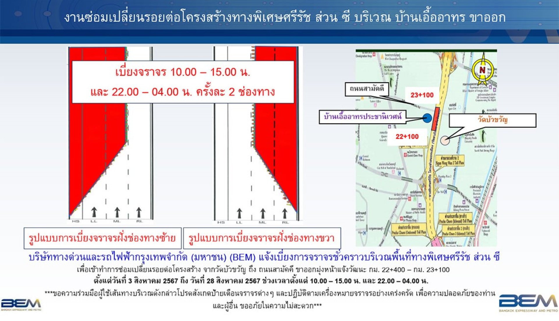 บริษัท ทางด่วนและรถไฟฟ้ากรุงเทพ จำกัด (มหาชน) หรือ BEM คำนึงถึงความปลอดภัยของผู้ใช้บริการทางพิเศษ จึงขอประชาสัมพันธ์แจ้งเบี่ยงการจราจรชั่วคราวบนทางพิเศษศรีรัช บริเวณบ้านเอื้ออาทรประชานิเวศน์ ฝั่งมุ่งหน้าแจ้งวัฒนะขาออก เพื่อดำเนินงานเปลี่ยนรอยต่อตามขวาง โดยจะปิดช่องจราจรครั้งละ 1 2 ช่องทาง และเบี่ยงการจราจรให้สามารถเดินทางโดยใช้ช่องทางถัดไป ตั้งแต่วันที่ 3 สิงหาคม 28 สิงหาคม 2567 ตั้งแต่เวลา 10.00 น. ถึง 15.00 น. และ 22.00 น. ถึง 04.00 น.