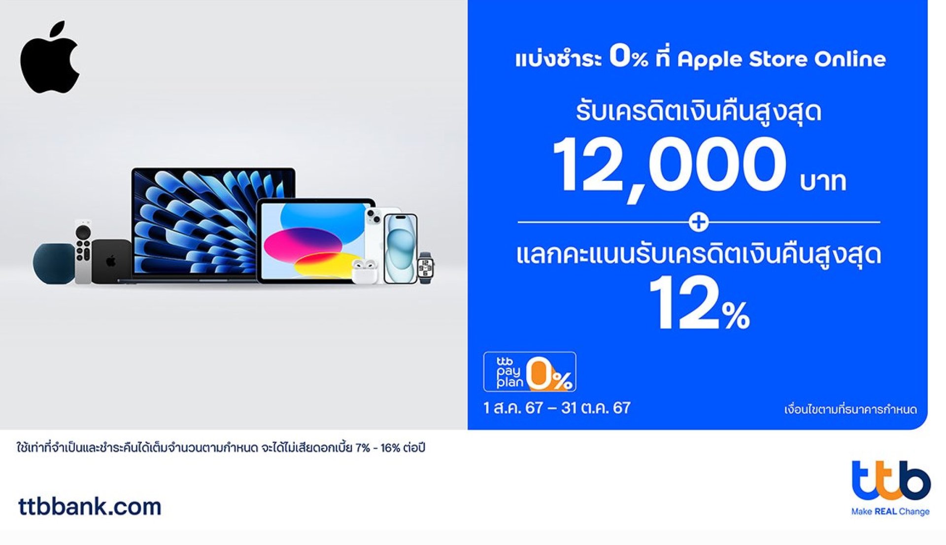 บัตรเครดิต ttb จัดโปรสุดคุ้ม แบ่งชำระ 0% ที่ Apple Store Online รับเครดิตเงินคืนสูงสุด 12,000 บาท พร้อมแลกคะแนนรับเครดิตเงินคืนสูงสุด 12%