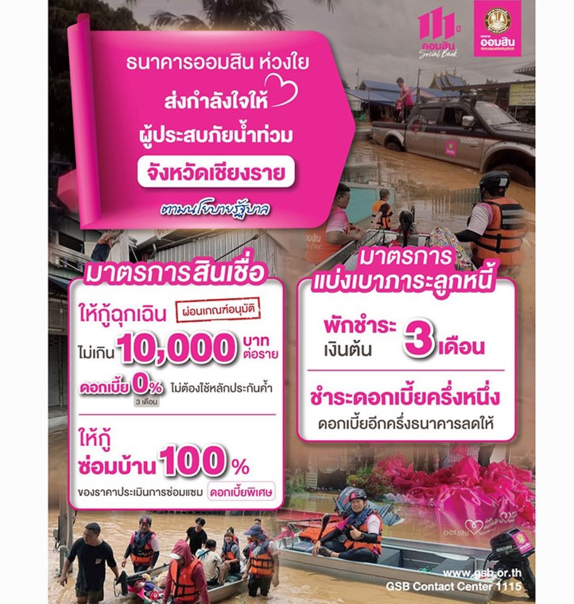 ออมสิน เร่งช่วยเหลือผู้ประสบอุทกภัยใหญ่ จ.เชียงราย ตามนโยบายรัฐ ออกมาตรการลดภาระ พักต้น ลดดอกครึ่งหนึ่ง นาน 3 เดือน กู้ฉุกเฉิน 0% ไม่ต้องมีหลักประกัน กู้ซ่อมบ้านได้ 100%