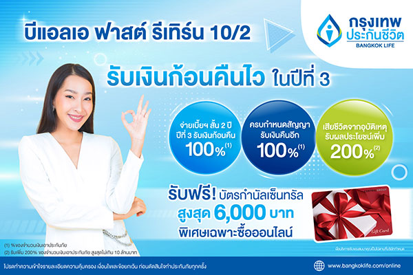 กรุงเทพประกันชีวิต ออกประกันสะสมทรัพย์ใหม่ รับเทศกาลลดหย่อนภาษี บีแอลเอ ฟาสต์ รีเทิร์น 10/2 จ่ายเบี้ยฯ สั้น 2 ปี รับเงินก้อนคืนไว
