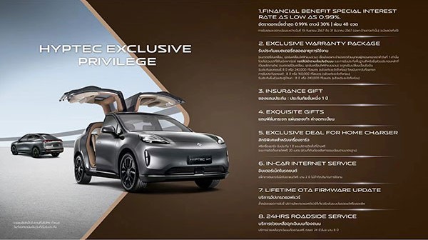 GAC AION สร้างความตื่นเต้นครั้งยิ่งใหญ่ในประเทศไทย เปิดตัวยานยนต์ไฟฟ้าแห่งอนาคต HYPTEC HT เอสยูวีไฟฟ้าลักซ์ชัวรี่ระดับไฮเอนด์ เน้นความหรูหราและเทคโนโลยีขั้นสูง ที่ผสานเข้ากับการออกแบบและการใช้งานได้อย่างสมบูรณ์แบบ ด้วยจุดเด่น 5 ด้านของตัวรถ ได้แก่ HYPTEC Design, HYPTEC Space, HYPTEC Smart, HYPTEC Energy และ HYPTEC Performance พร้อมลงสู้ศึกตลาดรถยนต์ไฟฟ้าระดับไฮเอนด์ เพื่อแสดงถึงความมุ่งมั่นในการนำเสนอความหรูหราเหนือระดับและเทคโนโลยีใหม่ในอุตสาหกรรมยานยนต์