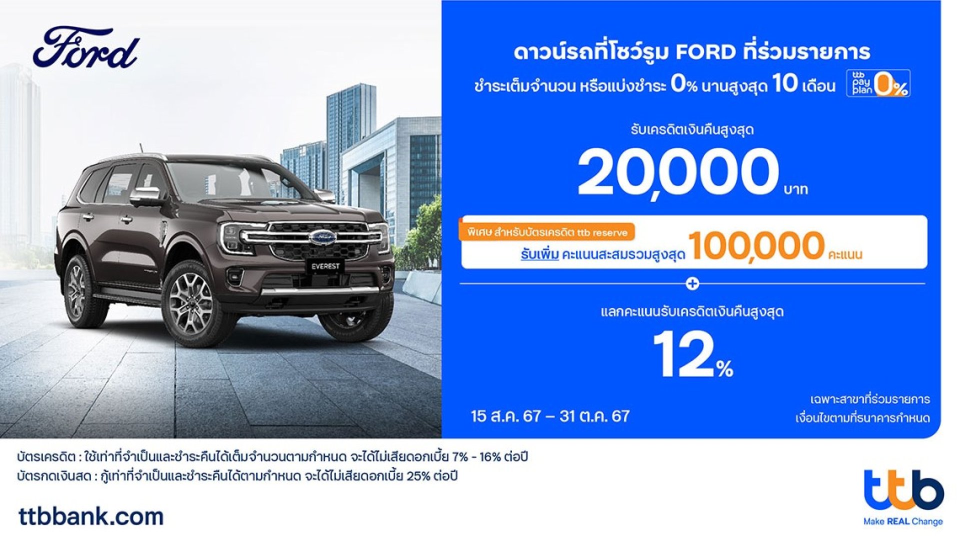ทีเอ็มบีธนชาต หรือ ทีทีบี จับมือโชว์รูม FORD มอบสิทธิพิเศษแก่ผู้ถือบัตรเครดิต และบัตรกดเงินสด ttb เมื่อดาวน์รถที่โชว์รูม FORD ที่ร่วมรายการ และชำระแบบเต็มจำนวน หรือแบบแบ่งชำระ 0% pay plan รับสิทธิพิเศษ 2 ต่อ ตั้งแต่วันนี้ถึง 31 ตุลาคม 2567
