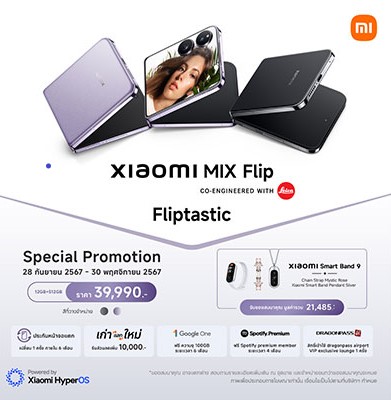Xiaomi MIX Flip มีให้เลือก 2 สี ได้แก่ Black และ Purple ในรุ่นความจุ 12GB+512GB วางจำหน่ายในราคา 39,990 บาท ที่ Xiaomi Store และร้านตัวแทนจำหน่ายที่ร่วมรายการทั่วประเทศ รวมถึงช่องทางการจัดจำหน่ายทางออนไลน์แพลตฟอร์ม พิเศษ! สำหรับลูกค้าที่ซื้อสมาร์ทโฟน Xiaomi MIX Flip ในระหว่างวันที่ 28 กันยายน - 30 พฤศจิกายน 2567 รับฟรี! Xiaomi Smart Band 9 และ VIP Services ต่างๆ รวมมูลค่าของสมนาคุณ 21,485 บาท