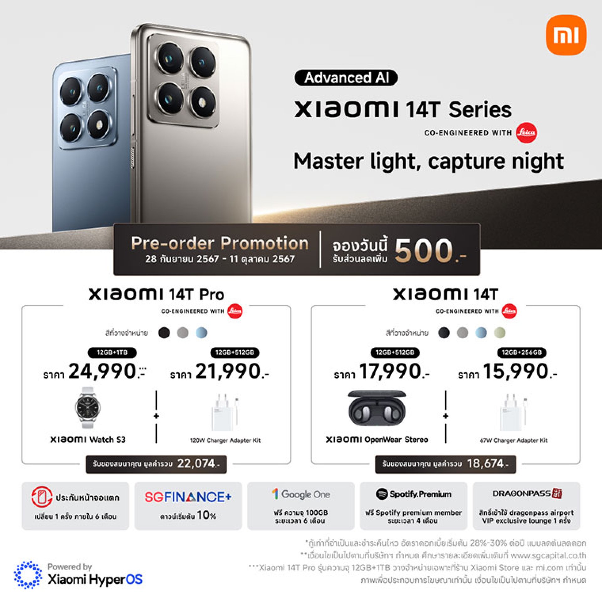 Pre-order Promotion สำหรับลูกค้าที่สั่งจองในระหว่างวันที่ 28 กันยายน - 11 ตุลาคม 2567 รับฟรี! Xiaomi Watch S3 และ 120W Charger Adapter Kit พร้อม VIP Services ต่างๆ รวมมูลค่าของสมนาคุณ 22,074 บาท