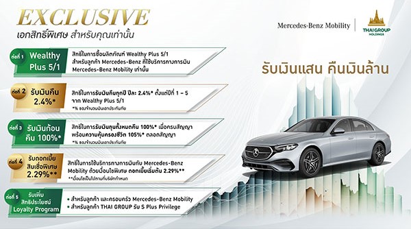 บริษัท ไทยกรุ๊ป โฮลดิ้งส์ จำกัด (มหาชน) กลุ่มธุรกิจประกันและการเงินในเครือทีซีซี โดยนายโชติพัฒน์ พีชานนท์ ประธานกรรมการบริหาร และ บริษัท เมอร์เซเดส-เบนซ์ โมบิลิตี้ (ประเทศไทย) จำกัด ผู้ให้บริการทางการเงินอย่างเป็นทางการสำหรับรถยนต์เมอร์เซเดส-เบนซ์ โดย นายศุภวุฒิ จีรมนัสนาคร ประธานกรรมการบริหาร ผนึกกำลังร่วมสร้างสรรค์นวัตกรรมทางการเงินที่คุ้มค่า สำหรับลูกค้าเมอร์เซเดส-เบนซ์ โมบิลิตี้ จัดงานเปิดตัวแคมเปญ รับเงินแสน คืนเงินล้าน ได้ทั้งรถใหม่ ผลตอบแทนพิเศษจากผลิตภัณฑ์ประกันจาก SE Life อาคเนย์ประกันชีวิต Wealthy Plus 5/1 ที่ออกแบบสำหรับแคมเปญนี้โดยเฉพาะ โดยจ่ายเบี้ยประกันภัยเพียงครั้งเดียว รับเงินคืน 2.4% ของเงินเอาประกันภัย ทุกปี ตลอด 5 ปี และเมื่อครบ 5 ปี ได้เงินคืนทั้งก้อน พร้อมได้รับสิทธิพิเศษอีกมากมายจากไทยกรุ๊ป โฮลดิ้งส์ ผ่านแพลตฟอร์ม S Plus Loyalty Program เฉพาะลูกค้าเมอร์เซเดส-เบนซ์ ที่ใช้บริการทางการเงินกับเมอร์เซเดส-เบนซ์ โมบิลิตี้ (ประเทศไทย) เท่านั้น
