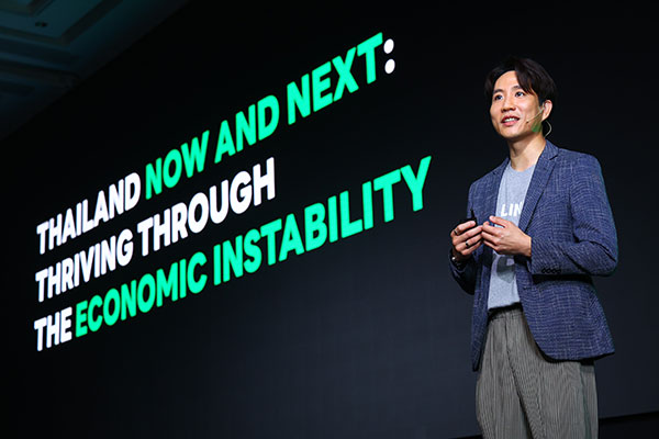 นายรัฐธีร์ ฉัตรดำรงค์ศักดิ์ รองประธานเจ้าหน้าที่ฝ่ายการพาณิชย์ LINE ประเทศไทย กล่าวว่า หลายปีที่ผ่านมา GDP ของไทยเติบโตแบบผันผวนจากทั้งปัจจัยภายในและภายนอกประเทศ ถึงแม้ในปี 2024 นี้ คาดว่าจะมีการฟื้นตัวด้วยอัตราการเติบโตประมาณ 2.3% ถึง 2.6% จากแรงสนับสนุนของภาคการท่องเที่ยวและการบริโภคในประเทศที่แข็งแกร่งขึ้น หากแต่หนี้ครัวเรือนที่มีสัดส่วนสูงถึงกว่า 90% รวมถึงปัจจัยลบภายนอกประเทศ ไม่ว่าจะเป็นความตึงเครียดทางภูมิรัฐศาสตร์ระดับโลก และการทะลักเข้ามาของสินค้าจีนในภูมิภาคอาเซียน ยังเป็นปัจจัยเสี่ยงที่น่ากังวล เหตุการณ์ที่กำลังเกิดขึ้นทั้งหลายเหล่านี้ ชี้ว่าประเทศไทยรวมถึงธุรกิจต่างๆ กำลังเผชิญกับความไม่แน่นอนทางเศรษฐกิจทั้งระดับมหภาคและจุลภาค LINE ในฐานะผู้นำแพลตฟอร์มดิจิทัลเพื่อธุรกิจของคนไทย จึงได้จัดงาน THAILAND NOW & NEXT: Thriving through The Economic Instability ชวนผู้เชี่ยวชาญร่วมอัปเดตสถานการณ์ที่กำลังเกิดขึ้น พร้อมนำเสนออินไซต์การใช้งานดาต้าของธุรกิจต่างๆ ในปัจจุบัน เพื่อเป็นแนวทางให้ธุรกิจนำไปพัฒนาต่อยอดเป็นกลยุทธ์ใหม่ ที่สามารถตอบสนองต่อการเปลี่ยนแปลงของตลาดหรือผู้บริโภคได้อย่างทันท่วงที