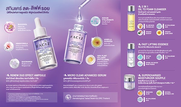 โดยการเปิดตัวครั้งนี้ Faciz มาพร้อม 5 ผลิตภัณฑ์ที่ช่วยบำรุงและลดปัญหาริ้วรอย ได้แก่