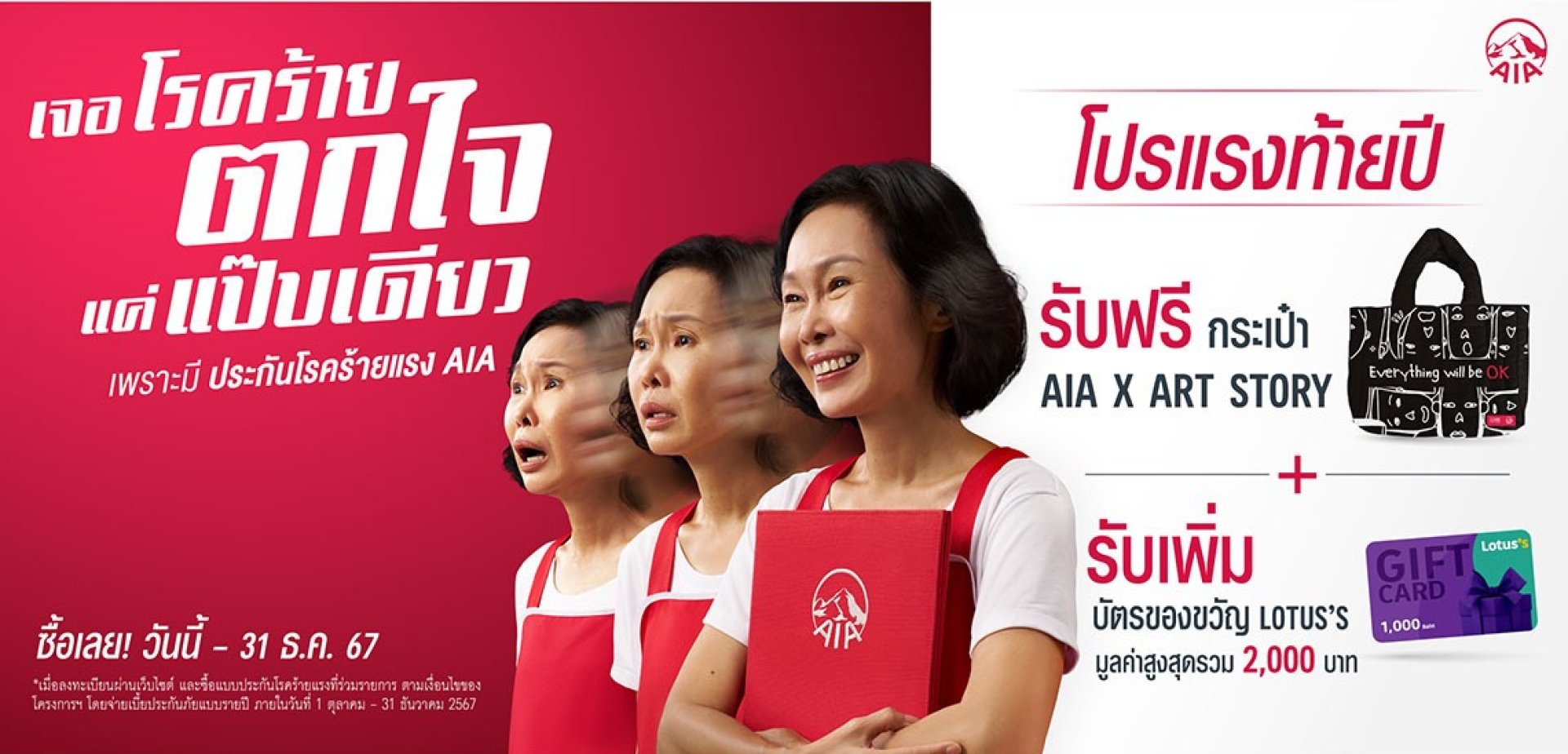 พิเศษยิ่งกว่าสำหรับแคมเปญ เจอโรคร้าย ตกใจแค่แป๊บเดียว ยังมีโปรโมชันและสิทธิพิเศษให้กับลูกค้าที่สนใจซื้อประกันโรคร้ายแรงตั้งแต่วันนี้ ถึง 31 ธันวาคม 2567 โดยเอไอเอ ได้รวมแพ็กประกันโรคร้ายแรงตัวท็อป ถึง 10 แผนมาให้ลูกค้าได้เลือกให้ตรงกับความต้องการและเหมาะสมกับค่าใช้จ่ายที่จำเป็น อาทิ AIA CI Plus ประกันโรคร้ายแรง เจอ-จ่าย-จบ ที่ให้เงินก้อนไว้ใช้รักษา AIA Multi-Pay CI Plus ประกันโรคร้ายแรง เจอ-จาย-หลายจบ ที่ให้เคลมได้รวมสูงสุดถึง 11 ครั้ง และ AIA Care For Cancer ประกันชดเชยรายได้ สำหรับการรักษาตัวในโรงพยาบาล เนื่องจากป่วยเป็นโรคมะเร็ง ทั้งนี้ ลูกค้ายังมีสิทธิพิเศษมากมาย เมื่อเข้าร่วมแคมเปญ ต่อที่หนึ่ง รับฟรีกระเป๋า AIA X ARTSTORY By Autistic Thai มูลค่า 250 บาท เมื่อมีเบี้ยประกันภัยรวมต่อปีขั้นต่ำ 25,000 บาท* และต่อที่สอง รับเพิ่มบัตรของขวัญ Lotuss มูลค่า 1,000 บาท เมื่อมีเบี้ยประกันภัยรวมต่อปีขั้นต่ำ 55,000 บาท* และพิเศษถ้าซื้อประกันสุขภาพที่ร่วมโครงการฯ รับเพิ่มบัตรของขวัญ Lotuss มูลค่าสูงสุด 1,000 บาทอีกด้วย เมื่อมีเบี้ยประกันภัยรวมขั้นต่ำ 25,000 บาท* ซึ่งทุกคนสามารถเข้าร่วมแคมเปญได้ง่าย ๆ เพียงลงทะเบียนผ่านเว็บไซต์ และซื้อประกันโรคร้ายแรงที่เข้าร่วมแคมเปญ** ตั้งแต่วันนี้ ถึง 31 ธันวาคม 2567 โดยสามารถศึกษารายละเอียดแคมเปญได้ที่เว็บไซต์ https://www.aia.co.th/th/events-promotions/promotions-rewards/dmtquarterly สนใจสามารถติดต่อตัวแทนเอไอเอ หรือ AIA Call Center 1581