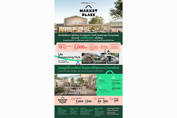 บริษัท เซ็นทรัลพัฒนา จำกัด (มหาชน) ผู้นำเบอร์หนึ่งอสังหาริมทรัพย์ไทยเพื่อความยั่งยืน ภายใต้วิสัยทัศน์ Imagining better futures for all เชื่อมโยงทุกธุรกิจทั้ง Retail-Residence-Hotel-Office สร้างความแข็งแกร่งใน The Ecosystem for All เดินหน้าพัฒนาธุรกิจ พร้อมเผยกลยุทธ์พลิกโฉม Community Mall Landscape ทั่วกรุงเทพฯ ด้วยการรีแบรนด์ครั้งใหญ่ Market Place (มาร์เก็ตเพลส) เจาะย่านเมืองเติบโต ที่อยู่อาศัยพุ่ง เพื่อตอบโจทย์ความต้องการเชิงลึกของลูกค้าได้เพิ่มขึ้น โดยทุ่มงบกว่า 2,000 ล้านบาท ในปี 5 พัฒนาและปรับโฉมโครงการรวม 15 สาขา บนโลเคชั่นศักยภาพสูง อาทิ มาร์เก็ตเพลส เจ อเวนิว, มาร์เก็ตเพลส ลา วิลล่า, มาร์เก็ตเพลส นางลิ้นจี่, มาร์เก็ตเพลส พหลโยธิน, มาร์เก็ตเพลส กรุงเทพกรีฑา, มาร์เก็ตเพลส ประชาอุทิศ, มาร์เก็ตเพลส เกษตร-นวมินทร์ เป็นต้น พร้อมเตรียมเปิดตัวโครงการใหม่ Market Place เทพรักษ์ ด้วยโมเดล Community Mall ผนวกกับ Urban Fresh Market เจาะใจกลางย่านเทพรักษ์-วัชรพล โซนกรุงเทพฯ ตอนเหนือ ในเดือนมกราคม 2568 รับเทศกาลตรุษจีนยิ่งใหญ่อีกด้วยบริษัท เซ็นทรัลพัฒนา จำกัด (มหาชน) ผู้นำเบอร์หนึ่งอสังหาริมทรัพย์ไทยเพื่อความยั่งยืน ภายใต้วิสัยทัศน์ Imagining better futures for all เชื่อมโยงทุกธุรกิจทั้ง Retail-Residence-Hotel-Office สร้างความแข็งแกร่งใน The Ecosystem for All เดินหน้าพัฒนาธุรกิจ พร้อมเผยกลยุทธ์พลิกโฉม Community Mall Landscape ทั่วกรุงเทพฯ ด้วยการรีแบรนด์ครั้งใหญ่ Market Place (มาร์เก็ตเพลส) เจาะย่านเมืองเติบโต ที่อยู่อาศัยพุ่ง เพื่อตอบโจทย์ความต้องการเชิงลึกของลูกค้าได้เพิ่มขึ้น โดยทุ่มงบกว่า 2,000 ล้านบาท ในปี 5 พัฒนาและปรับโฉมโครงการรวม 15 สาขา บนโลเคชั่นศักยภาพสูง อาทิ มาร์เก็ตเพลส เจ อเวนิว, มาร์เก็ตเพลส ลา วิลล่า, มาร์เก็ตเพลส นางลิ้นจี่, มาร์เก็ตเพลส พหลโยธิน, มาร์เก็ตเพลส กรุงเทพกรีฑา, มาร์เก็ตเพลส ประชาอุทิศ, มาร์เก็ตเพลส เกษตร-นวมินทร์ เป็นต้น