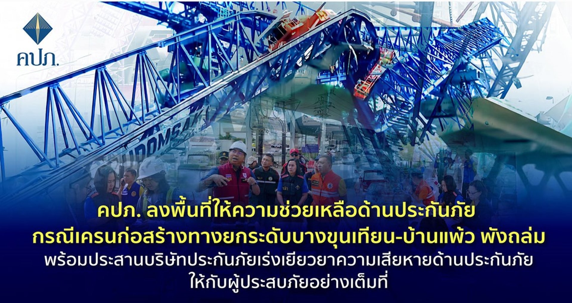 จากกรณีคานปูน (Segment) และเครน (Launching Gantry Crane) ซึ่งเป็นชิ้นส่วนและอุปกรณ์ที่ใช้ก่อสร้างทางยกระดับ โครงการก่อสร้างทางหลวงพิเศษหมายเลข 82 สายทางยกระดับบางขุนเทียน-บ้านแพ้ว ช่วงเอกชัย-บ้านแพ้ว ตอน 1 หมู่ที่ 2 ตำบลคอกกระบือ อำเภอเมือง จังหวัดสมุทรสาคร ได้พังถล่มลงมาระหว่างการก่อสร้าง ส่งผลทำให้มีผู้เสียชีวิต 6 ราย และบาดเจ็บ 9 คน เหตุเกิดเมื่อวันที่ 29 พฤศจิกายน 2567 นั้น เบื้องต้นสายส่งเสริมและประกันภัยภูมิภาค สำนักงาน คปภ. ภาค 7 (นครปฐม) และสำนักงาน คปภ. จังหวัดสมุทรสาคร ในฐานะพื้นที่เกิดเหตุเร่งบูรณาการร่วมกับหน่วยงานที่เกี่ยวข้องเพื่อตรวจสอบการทำประกันภัยและติดตามรายงานความเสียหายอย่างเร่งด่วนผ่าน Platform การรายงานข้อมูลกรณีอุบัติภัยกลุ่มหรือรายใหญ่ด้วยระบบอิเล็กทรอนิกส์ รวมทั้งลงพื้นที่เพื่ออำนวยความสะดวกด้านประกันภัยให้กับผู้ประสบภัยและครอบครัว เพื่อนำระบบประกันภัยช่วยบรรเทาความเดือดร้อนให้กับครอบครัวของผู้เสียชีวิตและผู้บาดเจ็บได้อย่างมีประสิทธิภาพและเป็นธรรม