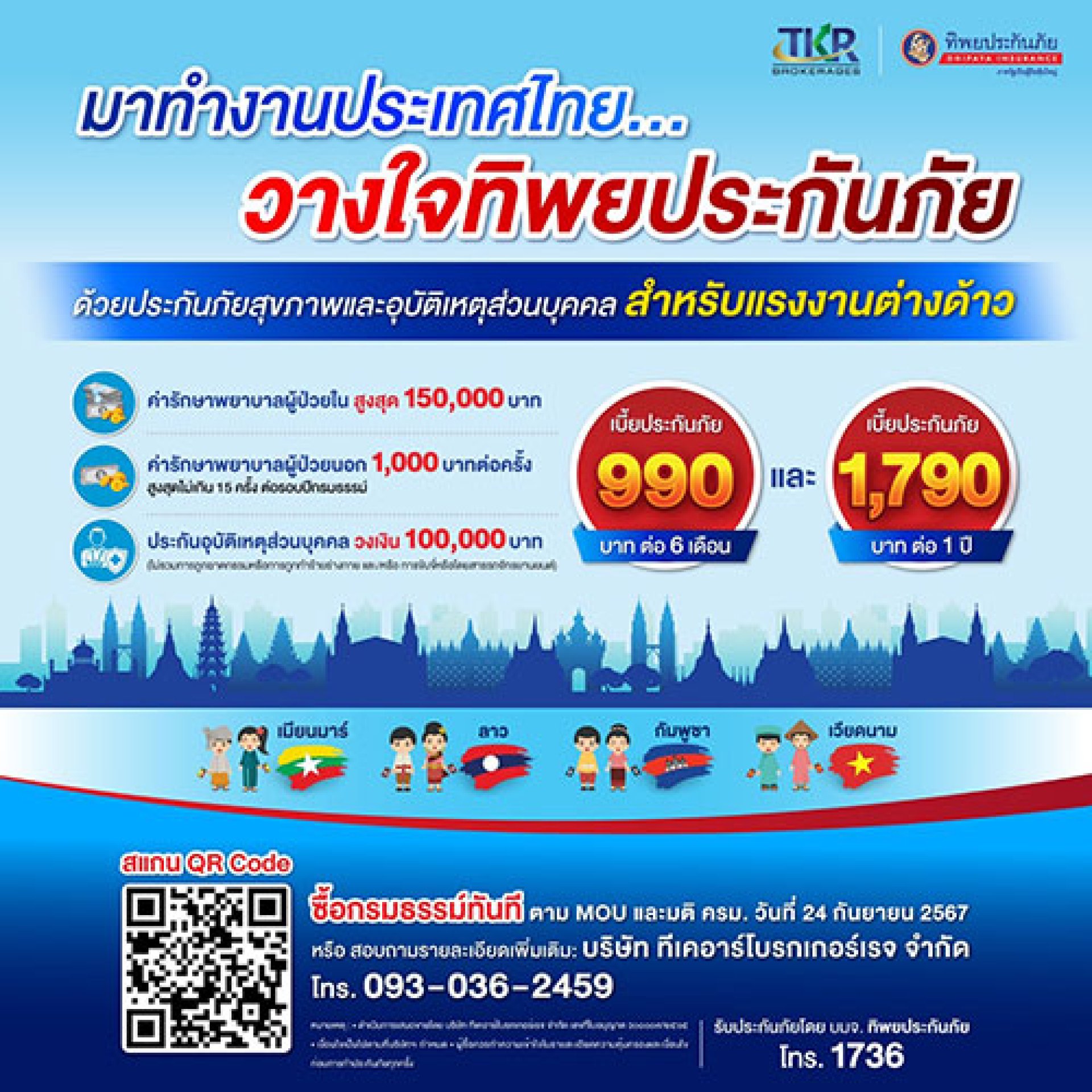 สำหรับรายละเอียดผลิตภัณฑ์หรือสนใจทำประกันภัยสุขภาพและอุบัติเหตุส่วนบุคคล สำหรับแรงงานต่างด้าว สามารถสอบถามเพิ่มเติมได้ที่ ทิพยประกันภัย โทร. 1736 หรือ บริษัท ทีเคอาร์โบรกเกอร์เรจ จำกัด โทร. 093-036-2459