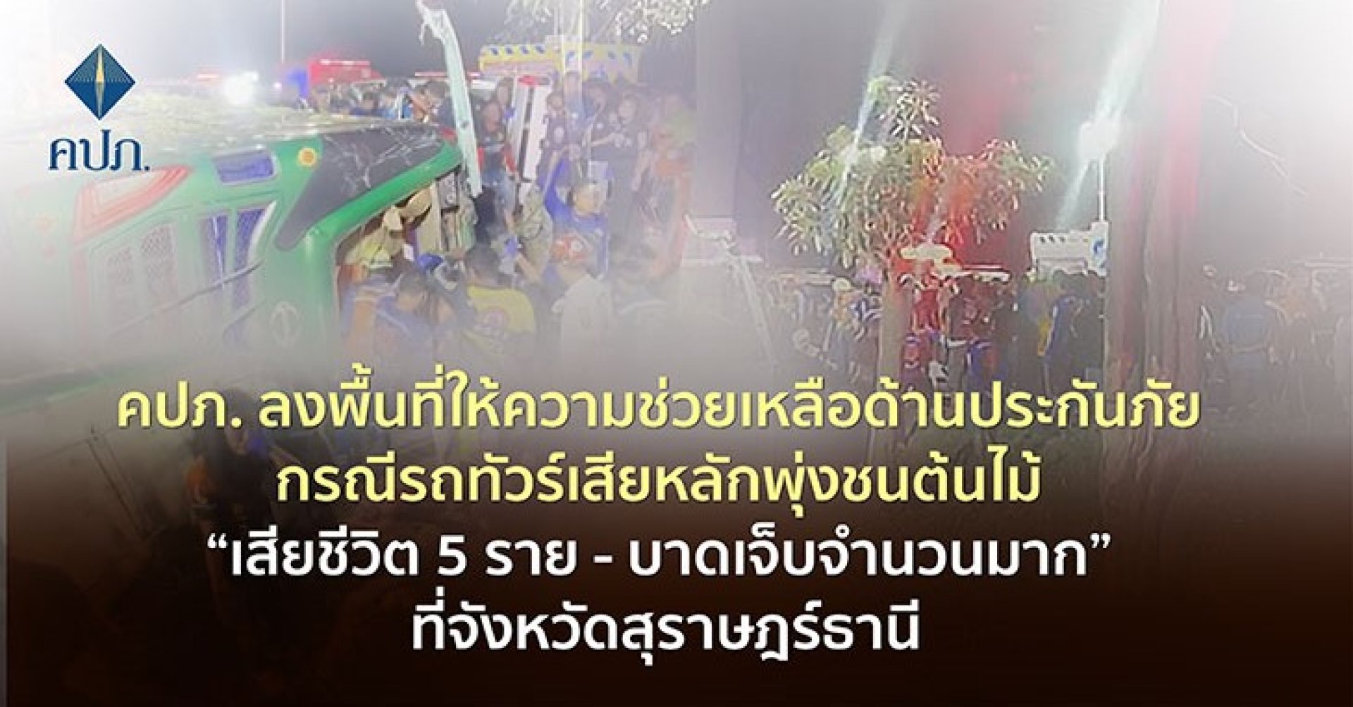 คปภ. ลงพื้นที่ให้ความช่วยเหลือด้านประกันภัย กรณีรถทัวร์เสียหลักพุ่งชนต้นไม้ “เสียชีวิต 5 ราย - บาดเจ็บจำนวนมาก” ที่จังหวัดสุราษฎร์ธานี