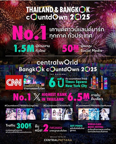 centralwOrld Bangkok Countdown 2025-The Original ประกาศศักดาไทยสู่สายตาชาวโลก ด้วยโปรดักชันดีที่สุดระดับโลก สุดอลังการ และบรรยากาศการเฉลิมฉลองระดับโลกที่จัดขึ้นที่ เซ็นทรัลเวิลด์-Times Square of Asia แลนด์มาร์กเคานต์ดาวน์ที่ยิ่งใหญ่ที่สุดของไทย ดึงดูดผู้เข้าร่วมงานกว่า 300,000 คน ที่เซ็นทรัลเวิลด์เพียงแห่งเดียว และทะลุ 1.5 ล้านคน ทั่วประเทศ นอกจากนี้ งานเคานต์ดาวน์ยังได้รับการถ่ายทอดสดไปทั่วโลกผ่าน CNN และจอ Times Square ที่มหานครนิวยอร์ก สะท้อนถึงศักยภาพของประเทศไทยในการจัดงานระดับสากลและสร้างโมเมนต์สำคัญในค่ำคืนข้ามปี มันส์จริง กระหึ่มจริง ฝีมือคนไทย ทุกองค์ประกอบ ตั้งแต่การออกแบบแสงสีเสียง ไปจนถึงการแสดงของศิลปินไทยกว่า 500 ชีวิต ทั่วประเทศ ตอกย้ำความเป็นมืออาชีพและมาตรฐานระดับโลก