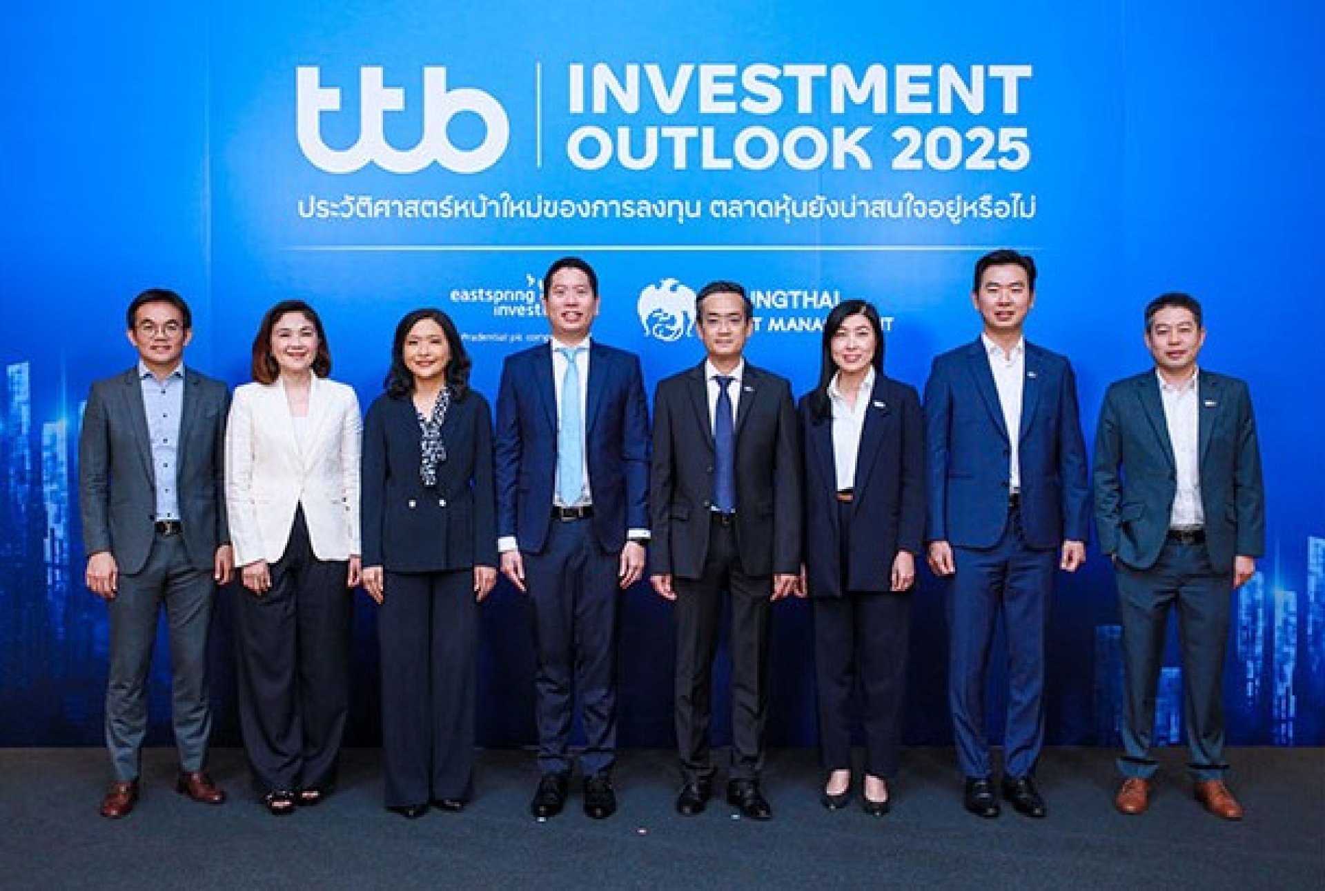 ทีเอ็มบีธนชาต หรือ ทีทีบี นำโดย นายนาวิน อินทรสมบัติ (ที่ 4 จากขวา) รองประธานเจ้าหน้าที่บริหาร หัวหน้าบริหารการลงทุน พร้อมด้วยทีมผู้บริหาร ร่วมกับพันธมิตร ได้แก่ บริษัท หลักทรัพย์นายหน้าซื้อขายหน่วยลงทุนอมุนดิ (ประเทศไทย) จำกัด, บริษัทหลักทรัพย์จัดการกองทุน อีสท์สปริง (ประเทศไทย) จำกัด และ บริษัทหลักทรัพย์จัดการกองทุน กรุงไทย จำกัด (มหาชน) จัดสัมมนา ttb investment outlook 2025 เพื่อเปิดประวัติศาสตร์หน้าใหม่ของการลงทุน ตลาดหุ้นยังน่าสนใจอยู่หรือไม่ โดยยกกองทัพกูรูและผู้เชี่ยวชาญด้านการลงทุน มาเปิดมุมมองและทิศทางการลงทุนตลาด เจาะแนวโน้มเศรษฐกิจ เปิดโอกาสการลงทุน ตอบโจทย์ทุกเป้าหมายการเงินในปี 2025 เพื่อช่วยสร้างโอกาสในการได้รับผลตอบแทนที่ดีจากการลงทุน นำไปสู่การมีชีวิตทางการเงินที่ดีขึ้นทั้งในวันนี้ และอนาคต ณ โรงแรมสยามเคมปินสกี้ กรุงเทพฯ เมื่อเร็ว ๆ นี้
