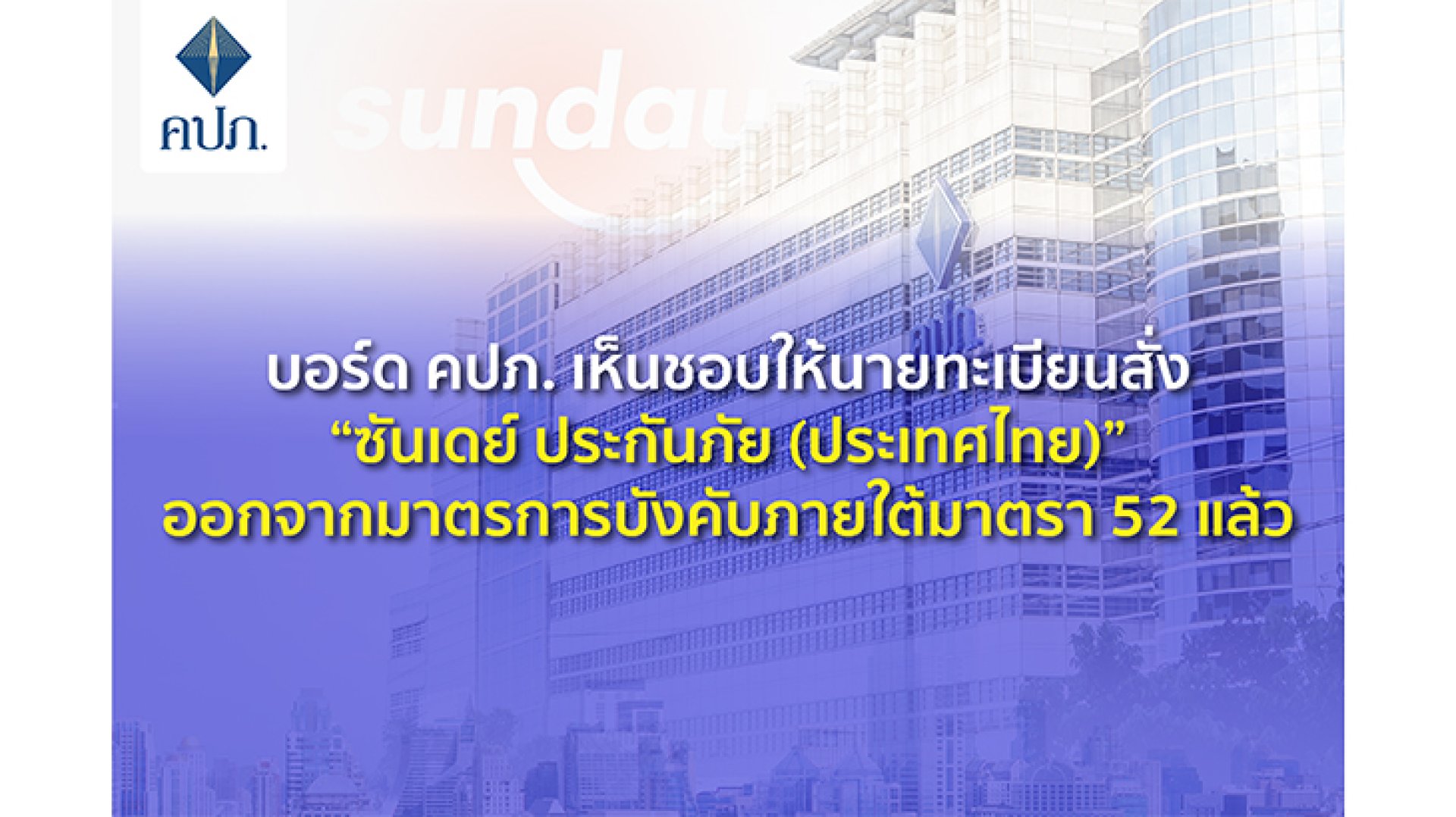 บอร์ด คปภ. เห็นชอบให้นายทะเบียนสั่ง “ซันเดย์ ประกันภัย (ประเทศไทย)” ออกจากมาตรการบังคับภายใต้มาตรา 52 แล้ว