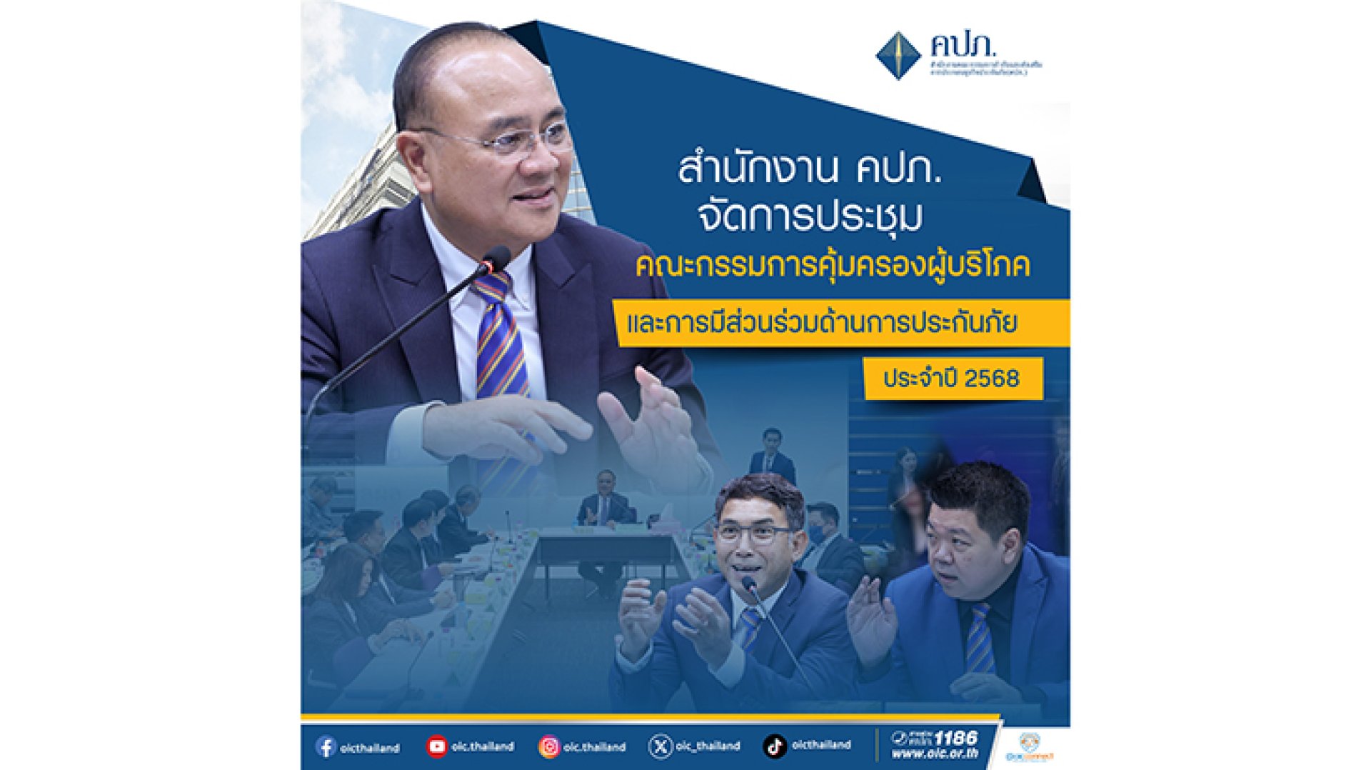 นายชูฉัตร ประมูลผล เลขาธิการคณะกรรมการกำกับและส่งเสริมการประกอบธุรกิจประกันภัย (เลขาธิการ คปภ.) เป็นประธานการประชุมคณะกรรมการคุ้มครองผู้บริโภคและการมีส่วนร่วมด้านการประกันภัย ประจำปี 2568 เพื่อพิจารณาหลักเกณฑ์เกี่ยวกับการมีส่วนร่วมจ่าย (Copayment) ในเงื่อนไขการต่ออายุสัญญาประกันภัย กรณีครบรอบปีกรมธรรม์ประกันภัยของสัญญาประกันภัยสุขภาพ โดยมีผู้แทนจากหน่วยงาน ประกอบด้วย สภาธุรกิจประกันภัยไทย สมาคมประกันชีวิตไทย สมาคมนายหน้าประกันภัยไทย สมาคมตัวแทนประกันชีวิตและที่ปรึกษาการเงิน สำนักงานคณะกรรมการคุ้มครองผู้บริโภค กรมส่งเสริมและพัฒนาคุณภาพชีวิตคนพิการ กรมคุ้มครองสิทธิและเสรีภาพ มูลนิธิพระมหาไถ่เพื่อการพัฒนาคนพิการ และหน่วยงานที่เกี่ยวข้อง เข้าร่วมประชุม ณ ห้องประชุมสถาบันวิทยาการประกันภัยระดับสูง ชั้น 1 สำนักงาน คปภ. (รัชดาภิเษก)