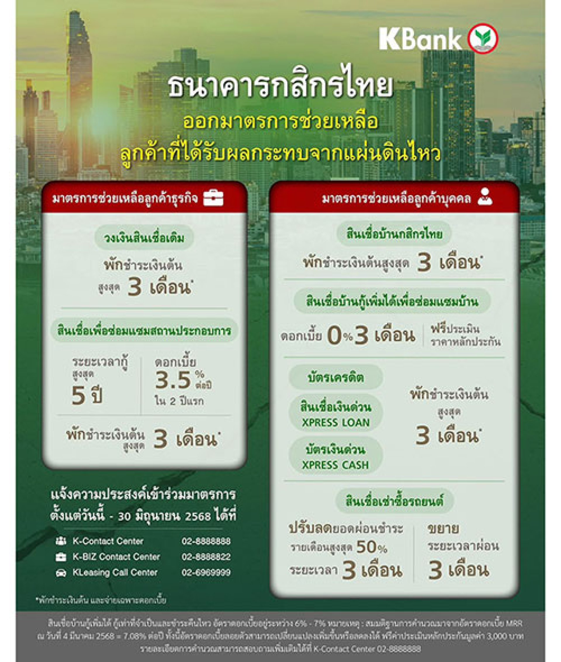 กสิกรไทยออกมาตรการช่วยเหลือลูกค้าที่ได้รับผลกระทบจากแผ่นดินไหวที่เกิดขึ้น เมื่อวันที่ 28 มีนาคมที่ผ่านมา ด้วยมาตรการพักชำระเงินต้น ผ่อนเฉพาะดอกเบี้ยนานสูงสุด 3 เดือน วงเงินสินเชื่อที่กู้เพิ่มได้เพื่อซ่อมแซมบ้านและสถานประกอบการ และสินเชื่ออื่นๆ พร้อมแนะแนวทางการรับมือกับเหตุการณ์ที่เกิดขึ้นกสิกรไทยออกมาตรการช่วยเหลือลูกค้าที่ได้รับผลกระทบจากแผ่นดินไหวที่เกิดขึ้น เมื่อวันที่ 28 มีนาคมที่ผ่านมา ด้วยมาตรการพักชำระเงินต้น ผ่อนเฉพาะดอกเบี้ยนานสูงสุด 3 เดือน วงเงินสินเชื่อที่กู้เพิ่มได้เพื่อซ่อมแซมบ้านและสถานประกอบการ และสินเชื่ออื่นๆ พร้อมแนะแนวทางการรับมือกับเหตุการณ์ที่เกิดขึ้น
