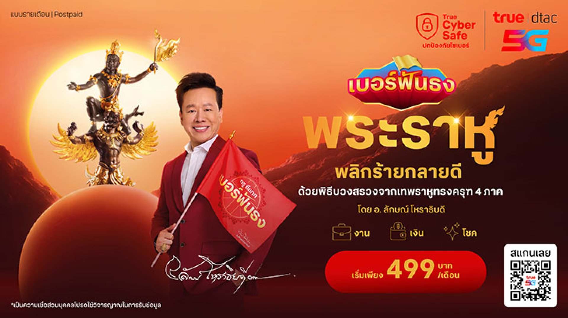 ทรู คอร์ปอเรชั่น ร่วมกับ อาจารย์ลักษณ์ โหราธิบดี อาจารย์ด้านโหราศาสตร์อันดับ 1 ของเมืองไทย ผู้ศึกษาและเชี่ยวชาญเรื่องดวงดาวและเทพพระราหู เปิดตัว เบอร์ฟันธง พระราหู เสริมสิริมงคลรับการย้ายครั้งสำคัญของ ดาวพระราหู ในรอบ 18 ปื ซึ่งจะเกิดขึ้นในวันที่ 5 พฤษภาคม 2568 นี้ ฟันธงทุกเบอร์ผ่านพิธีเทพบูชาพระราหูทรงครุฑ ณ 4 สถานที่ศักดิ์สิทธิ์ 4 ภาคทั่วประเทศ โดย อ.ลักษณ์ โหราธิบดี ช่วยพลิกร้ายกลายดี เพิ่มพลังมงคลชีวิต เปลี่ยนดวงดีแล้วให้ดียิ่งขึ้น ลูกค้าทรู ดีแทค สายมูที่ต้องการเสริมดวงให้โดดเด่นทุกด้านทั้งงาน เงิน โชคลาภ สามารถเลือก เบอร์ฟันธง พระราหู แบบรายเดือน แพ็กเกจ 499 บาท เบอร์สวย จำง่าย ไม่มีค่าเลือกเบอร์ พร้อมเปิดเบอร์ได้แล้วตั้งแต่วันที่ 16 เมษายน 2568 เป็นต้นไป ที่ ทรูช็อป ดีแทคช็อป ทุกสาขาทั่วประเทศ หรือเว็บไซต์มหาจักรวาลเบอร์มงคล lucky-number.true.th รีบเลย! เบอร์มีจำนวนจำกัด