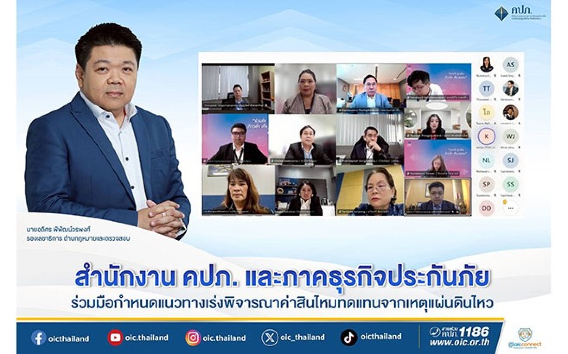 สำนักงานคณะกรรมการกำกับและส่งเสริมการประกอบธุรกิจประกันภัย (สำนักงาน คปภ.) ประชุมร่วมกับเอกชนภาคอุตสาหกรรมประกันภัย ในรูปแบบออนไลน์ ผ่านระบบ Microsoft Teams Meeting เพื่อหารือแนวทางการเร่งตรวจสอบและออกหลักฐานรับผิดชอบให้แก่ประชาชนผู้ได้รับความเสียหาย โดย นายอดิศร พิพัฒน์วรพงศ์ รองเลขาธิการ ด้านกฎหมายและตรวจสอบ สำนักงาน คปภ. ประธานที่ประชุม ได้ให้ความสำคัญของการให้บริการตรวจสอบความเสียหายและอำนวยความสะดวกแก่ประชาชนในการเรียกร้องให้บริษัทประกันภัยชดใช้ค่าสินไหมทดแทนในเหตุแผ่นดินไหว ซึ่งที่ประชุมมีความเห็นพ้องกันว่าจะเร่งดำเนินการจ่ายค่าสินไหมทดแทนโดยเร็วที่สุด ซึ่ง สำนักงาน คปภ. ขอให้ภาคเอกชนรายงานข้อมูลการพิจารณาจ่ายค่าสินไหมทดแทนแก่ประชาชน ให้สำนักงาน คปภ. ทราบ เพื่อติดตาม ตรวจสอบความถูกต้อง สร้างความมั่นใจให้กับประชาชนในการใช้ระบบประกันภัยบริหารความเสี่ยง และได้รับการคุ้มครองสิทธิประโยชน์ด้านการประกันภัย