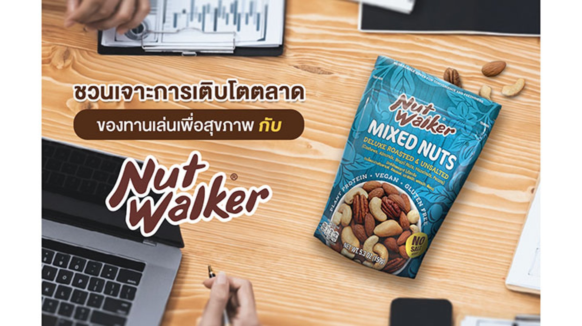 คาดการณ์ว่าในปี 2568 ของทานเล่นเพื่อสุขภาพที่ผลิตจากพืชจะได้รับความนิยมในวงกว้างมากขึ้น ผู้คนจะให้ความสนใจกับโปรตีนจากพืชในหลากหลายแหล่งที่มา ไม่จำกัดอยู่กับชนิดที่เป็นที่นิยมอย่างเดียว นอกจากนี้ผลิตภัณฑ์ที่เน้นความกรุบกรอบ พกพาสะดวก พร้อมทานได้ทันที ก็จะเป็นเหตุผลหลัก ๆ ที่ทำให้ผู้บริโภคตัดสินใจเลือกซื้อสินค้าเช่นกัน นัท วอล์คเกอร์ อยากเสนออีกหนึ่งทางเลือกที่น่าสนใจให้กับผู้ที่อยากทดลองทานสแน็คเพื่อสุขภาพ กับ นัท วอล์คเกอร์ มิกซ์นัทเดอลุกซ์ ไม่ใส่เกลือ รวบรวมถั่วคุณภาพพรีเมียม 5 ชนิด ไว้ในซองเดียว พร้อมคุณประโยชน์แบบจัดเต็ม ไม่ว่าจะเป็น อัลมอนด์ที่อุดมด้วยวิตามินอี ช่วยต้านอนุมูลอิสระได้เป็นอย่างดี เมล็ดมะม่วงหิมพานต์มีกรดไขมันไม่อิ่มตัวที่ช่วยลดไขมันในเลือด ทำให้ความเสี่ยงอ้วนลงพุงลดต่ำลง เฮเซลนัทเต็มไปด้วยไปด้วยกรดไขมันโอเมก้า 9 เช่น กรดโอเลอิก ซึ่งเป็นสารป้องกันมะเร็ง บราซิลนัท อัดแน่นไปด้วยธาตุซีลีเนียม ซึ่งมีผลต่อการทำงานของต่อมไทรอยด์ และพีแคนเป็นแหล่งของแมงกานีส ที่ควบคุมระดับน้ำตาลในเลือดได้