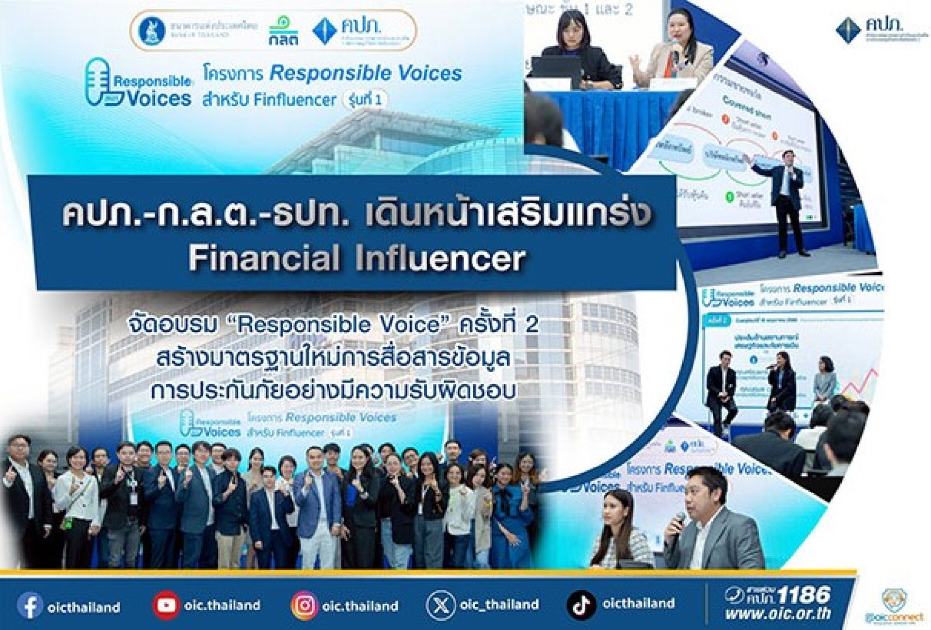 สำนักงานคณะกรรมการกำกับและส่งเสริมการประกอบธุรกิจประกันภัย (สำนักงาน คปภ.) จัดอบรมโครงการ Responsible Voice สำหรับ Financial Influencer รุ่นที่ 1 ครั้งที่ 2 ณ ห้องประชุมชั้น 2 อาคารวิทยาการประกันภัยระดับสูง สำนักงาน คปภ. ถนนรัชดาภิเษก โดยมีวัตถุประสงค์เพื่อเสริมสร้างองค์ความรู้ด้านการประกันภัย ให้แก่ ผู้สร้างคอนเทนต์ในสายการเงิน การลงทุน และการประกันภัย เพื่อให้สามารถสื่อสารข้อมูลได้อย่างถูกต้อง มีความรับผิดชอบ และเข้าใจง่ายสำหรับประชาชน โดยโครงการนี้ถือเป็นความร่วมมือครั้งสำคัญระหว่าง 3 หน่วยงานกำกับของไทย ได้แก่ สำนักงาน คปภ. ธนาคารแห่งประเทศไทย (ธปท.) และสำนักงานคณะกรรมการกำกับหลักทรัพย์และตลาดหลักทรัพย์ (ก.ล.ต.) ซึ่งได้คัดเลือก Financial Influencer (Finfluencer) จำนวน 50 คนจากหลากหลายแพลตฟอร์ม เข้าร่วมอบรมในหัวข้อที่เกี่ยวข้องกับการให้ข้อมูลด้านการเงิน การลงทุน และการประกันภัย โดยกิจกรรมการอบรมแบ่งออกเป็น 3 ครั้ง ใน 3 สถานที่ของแต่ละหน่วยงาน โดยการอบรมครั้งที่ 1 ได้จัดขึ้นเมื่อวันที่ 9 พฤษภาคม 2568 ณ สำนักงาน ก.ล.ต. ภายใต้หัวข้อเรียนรู้แนวทางการให้ข้อมูลทางการเงิน การลงทุน และการประกันภัย ทั้งนี้ กลุ่มงานสื่อสารองค์กร สายกลยุทธ์องค์กร ของสำนักงาน คปภ. ได้ร่วมเป็นกลไกหลักในการประสานความร่วมมือระหว่างหน่วยงาน ทั้งการจัดทำเนื้อหาหลักสูตร การรับสมัคร Finfluencer การคัดเลือกผู้เข้าอบรม และบริหารจัดการกิจกรรมต่าง ๆ รวมถึงกิจกรรม Workshop เพื่อให้การดำเนินโครงการนี้ บรรลุเป้าหมายในการยกระดับมาตรฐานการสื่อสารและความร่วมมือในภาคการเงินทั้ง 3 หน่วยงานอย่างมีประสิทธิภาพและยั่งยืน