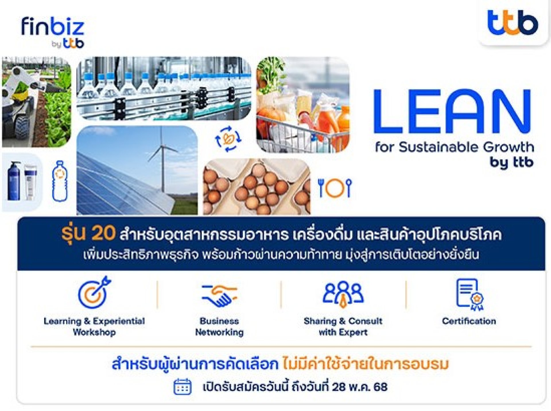 ทีเอ็มบีธนชาต หรือ ทีทีบี มุ่งมั่นสนับสนุนให้ลูกค้าธุรกิจสามารถบริหารองค์กรได้อย่างมีประสิทธิภาพ พร้อมก้าวผ่านความท้าทาย มุ่งสู่การเติบโตอย่างยั่งยืน จัดหลักสูตร LEAN for Sustainable Growth by ttb รุ่น 20 สำหรับอุตสาหกรรมอาหาร เครื่องดื่ม และสินค้าอุปโภคบริโภค เปิดรับสมัครตั้งแต่วันนี้ ถึง 28 พฤษภาคม 2568 อบรมฟรี ไม่มีค่าใช้จ่าย