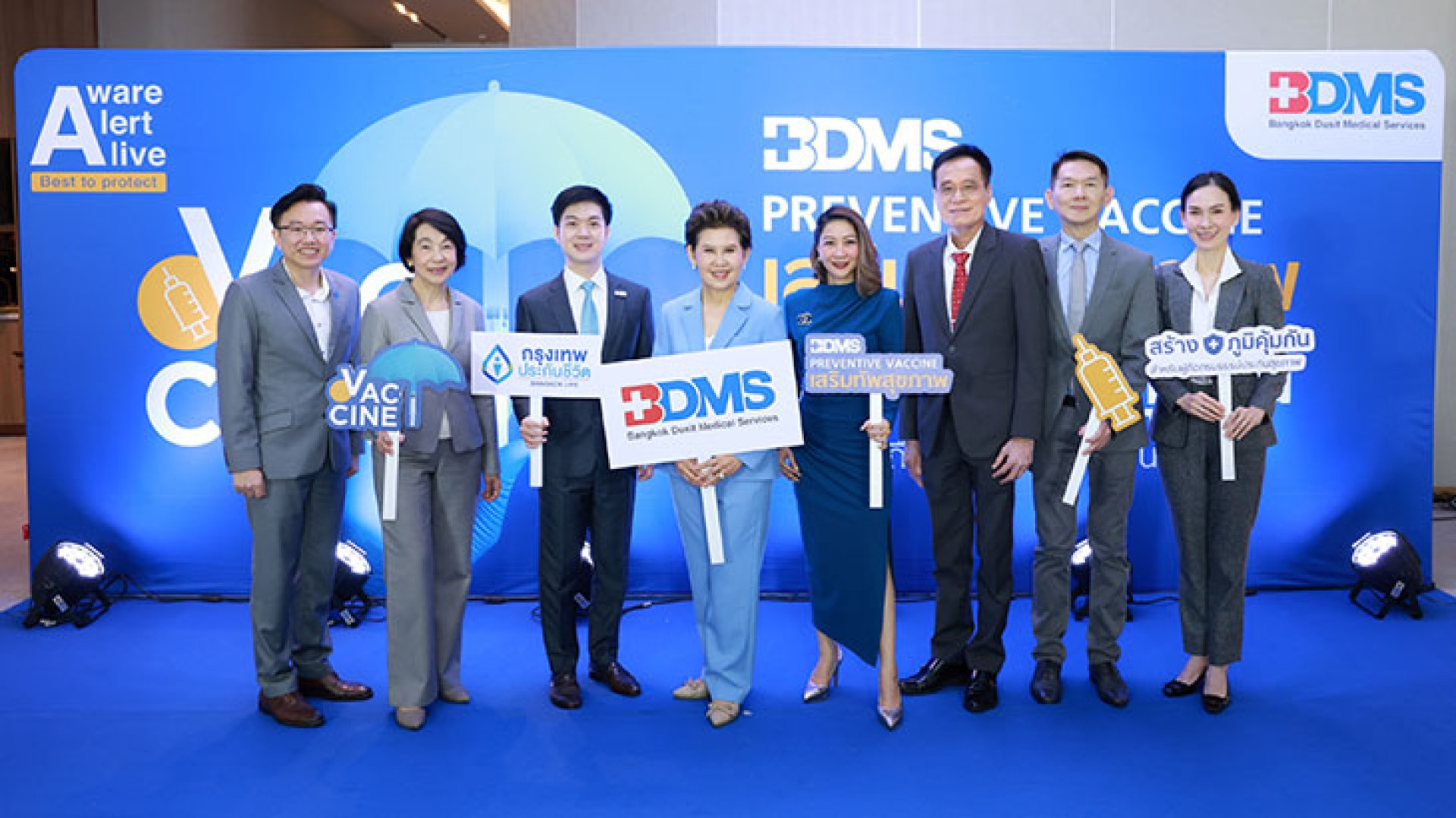 บริษัท กรุงเทพประกันชีวิต จำกัด (มหาชน) นำโดย นางสาวอรนาฎ นชะพงษ์ (ที่ 4 จากขวา) ผู้ช่วยผู้จัดการใหญ่ สายกลยุทธ์การตลาดและบริหารจัดการลูกค้า พร้อมด้วยนายแพทย์วิรุณ เกียรติคุณรัตน์ (ที่ 3 จากซ้าย) ผู้ช่วยผู้อำนวยการ ศูนย์บริการการแพทย์ ร่วมงานแถลงข่าว " BDMS Preventive Vaccine " ซึ่งเป็นความร่วมมือระหว่างโรงพยาบาลในเครือ BDMS กับบริษัทประกันชีวิตชั้นนำในการจัด " โครงการฉีดวัคซีนเพื่อป้องกันโรคในราคาพิเศษ " โดยมีวัตถุประสงค์เพื่อส่งเสริมการดูแลสุขภาพเชิงป้องกันอย่างยั่งยืนในกลุ่มผู้ถือกรมธรรม์ประกันสุขภาพ ณ ห้องประชุมเรเดียน โรงแรมเมอวินพิค บีดีเอ็มเอส เวลเนส รีสอร์ท เมื่อเร็วๆนี้