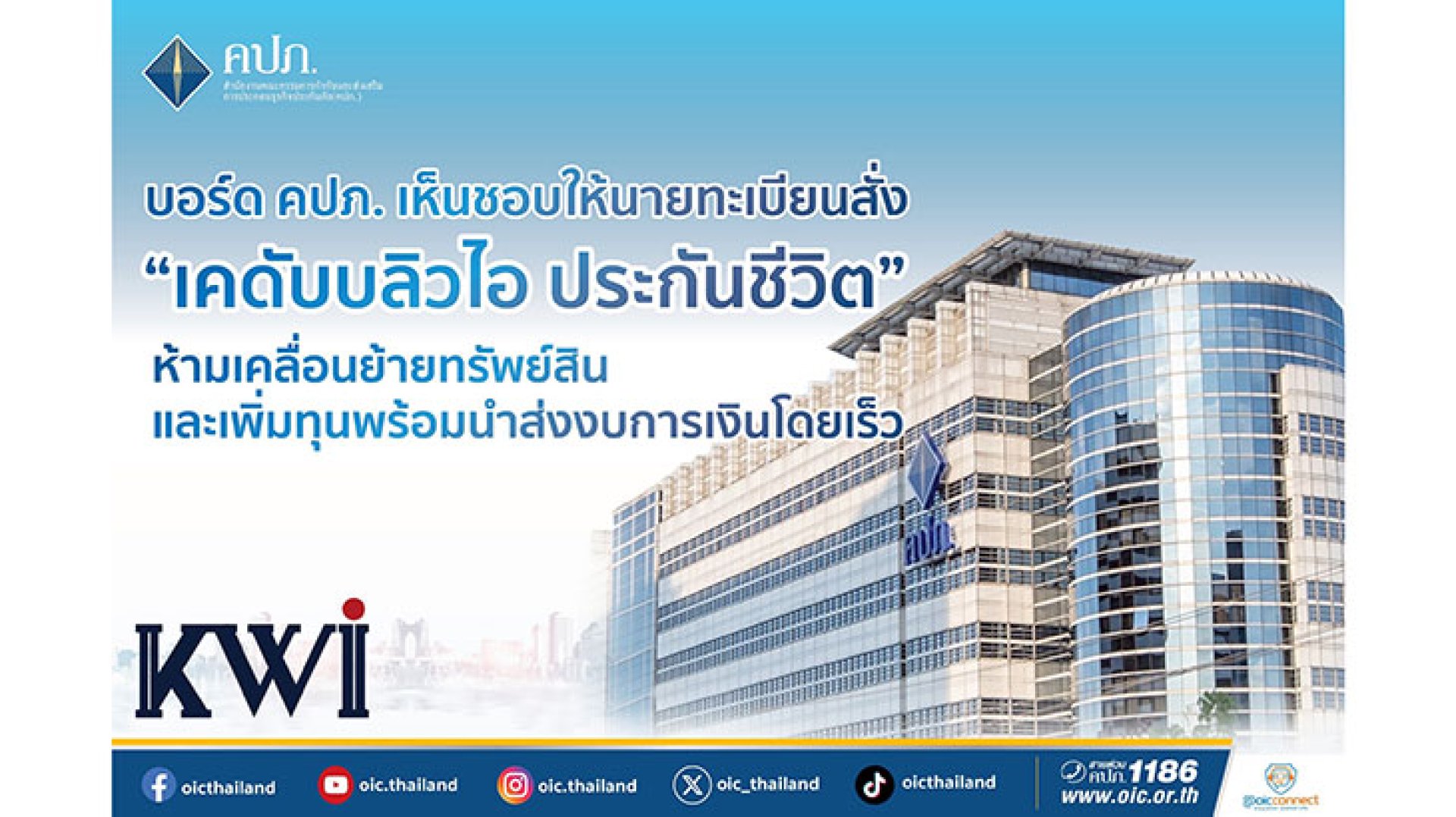 บอร์ด คปภ. เห็นชอบให้นายทะเบียนสั่ง “เคดับบลิวไอ ประกันชีวิต” ห้ามเคลื่อนย้ายทรัพย์สินและเพิ่มทุนพร้อมนำส่งงบการเงินโดยเร็ว
