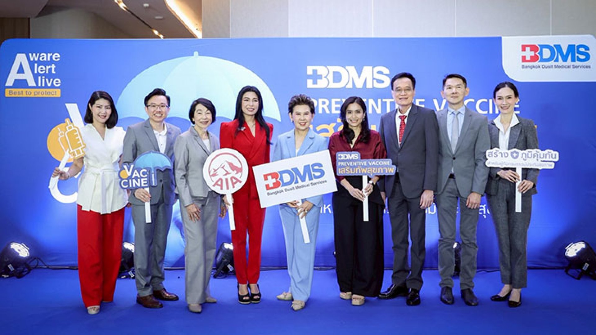 เอไอเอ ประเทศไทย นำโดย นางสาวรพีพร วงศ์ทองคำ (ที่ 4 จากซ้าย) ผู้อำนวยการฝ่ายสื่อสารองค์กรและภาพลักษณ์ จับมือบริษัท กรุงเทพดุสิตเวชการ จำกัด (มหาชน) หรือ BDMS นำโดย นางนฤมล น้อยอ่ำ (กลาง) รองกรรมการผู้อำนวยการใหญ่อาวุโส และประธานเจ้าหน้าที่บริหารด้านการเงิน ร่วมเปิดแคมเปญ BDMS PREVENTIVE VACCINE มอบวัคซีนราคาพิเศษให้แก่ลูกค้าเอไอเอที่มีประกันสุขภาพ โดยครอบคลุม 4 โรคหลัก ได้แก่ ไข้หวัดใหญ่ ปอดอักเสบ ไข้เลือดออก และงูสวัด ซึ่งถือเป็นส่วนหนึ่งของโครงการ Healthier You เริ่มต้นที่การฉีดวัคซีน ที่เอไอเอ ต้องการรณรงค์สร้างเกราะป้องกันโรคให้แก่คนไทยอย่างต่อเนื่องตลอดทั้งปี ตอกย้ำถึงพันธกิจของเอไอเอ ที่มุ่งสนับสนุนผู้คนให้มีสุขภาพและชีวิตที่ดีขึ้น ตามคำมั่นสัญญา Healthier, Longer, Better Lives