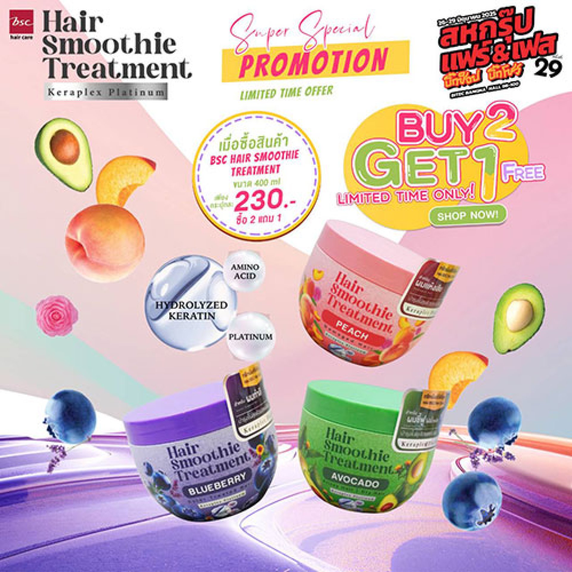 BSC HAIR CARE ในเครือโอซีซี กรุ๊ป แจกโปรโมชั่นสุดว้าว ถึง 2 ต่อ ต่อที่ 1 เมื่อซื้อทรีตเม้นท์บำรุงเส้นผม BSC hair care Hair Smoothie Treatment 400g ซึ่งมีให้เลือก 3 สูตร ได้แก่ สูตร Peach เหมาะสำหรับผมแห้งเสียมาก, สูตร Blueberry เหมาะสำหรับผมทำสี และสูตร Avocado เหมาะสำหรับผมชี้ฟู ไม่มีน้ำหนัก ได้ในราคาพิเศษ 230 บาท จากปกติ 295 บาท ต่อที่ 2 เมื่อซื้อทรีตเม้นท์บำรุงเส้นผม จำนวน 2 ชิ้น สูตรใดก็ได้ แถมเลยทันทีอีก 1 ชิ้นฟรี! โปรฯ นี้เฉพาะที่งาน สหกรุ๊ปแฟร์ & เฟส ครั้งที่ 29 ณ ศูนย์นิทรรศการและการประชุมไบเทค ฮอลล์ 98-100 ในวันที่ 26 - 29 มิถุนายน 2568 ตั้งแต่เวลา 10.00 - 21.00 น.