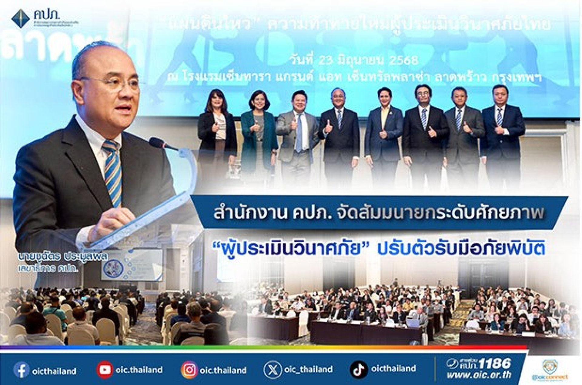 นายชูฉัตร ประมูลผล เลขาธิการคณะกรรมการกำกับและส่งเสริมการประกอบธุรกิจประกันภัย (เลขาธิการ คปภ.) เป็นประธานเปิดงานสัมมนาผู้ประเมินวินาศภัย ปี 2568 ณ ห้องวิภาวดีบอลรูม ซี โรงแรมเซ็นทาราแกรนด์ แอท เซ็นทรัลพลาซา ลาดพร้าว กรุงเทพฯ โดยมี นางสาววสุมดี วสีนนท์ รองเลขาธิการ ด้านกำกับคนกลางและประกันภัยภูมิภาค ผู้บริหารสำนักงาน คปภ. ผู้บริหารสมาคม ผู้ประเมินวินาศภัย และสมาคมการค้าผู้สำรวจและประเมินวินาศภัยไทย ผู้ตรวจสอบและประเมินวินาศภัย เข้าร่วมงานกว่า 200 คน