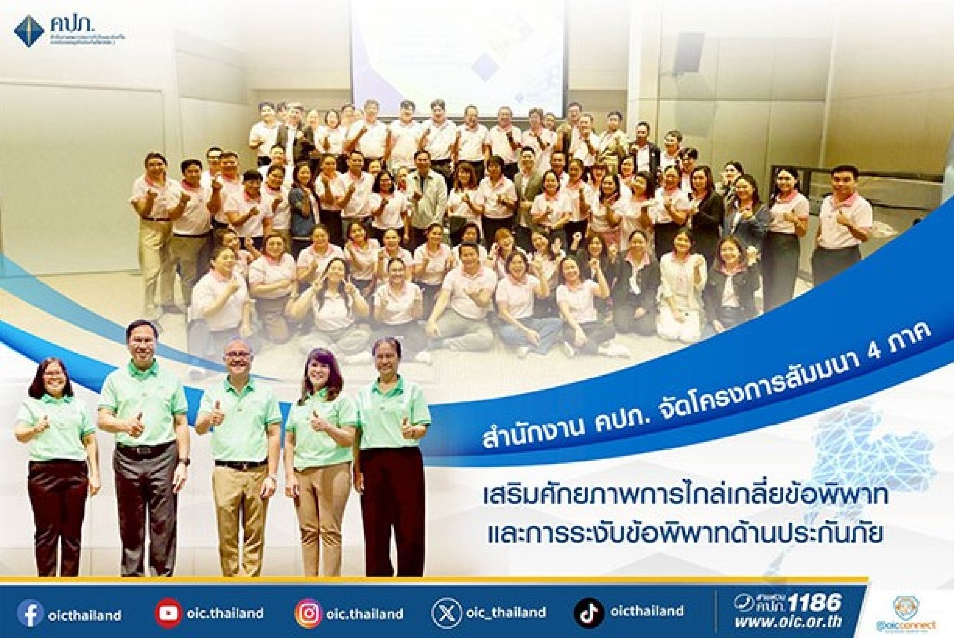 สำนักงานคณะกรรมการกำกับและส่งเสริมการประกอบธุรกิจประกันภัย (สำนักงาน คปภ.) โดยสายคุ้มครองสิทธิประโยชน์ จัดโครงการเสริมสร้างความรู้ เพิ่มศักยภาพการปฏิบัติงานด้านการไกล่เกลี่ยและระงับข้อพิพาทด้านประกันภัย 4 ครั้งทั่วประเทศ โดยการสัมมนาครั้งที่ 1 จัดขึ้นเมื่อวันที่ 1819 มิถุนายน 2568 เป็นการจัดอบรมให้แก่ เจ้าหน้าที่ของสำนักงาน คปภ. ส่วนภูมิภาคพื้นที่สำนักงาน คปภ. ภาค 6 และสำนักงาน คปภ. ภาค 7 ณ โรงแรมโอ๊ควูด โฮเทล แอนด์ เรสซิเดนซ์ ศรีราชา จังหวัดชลบุรี