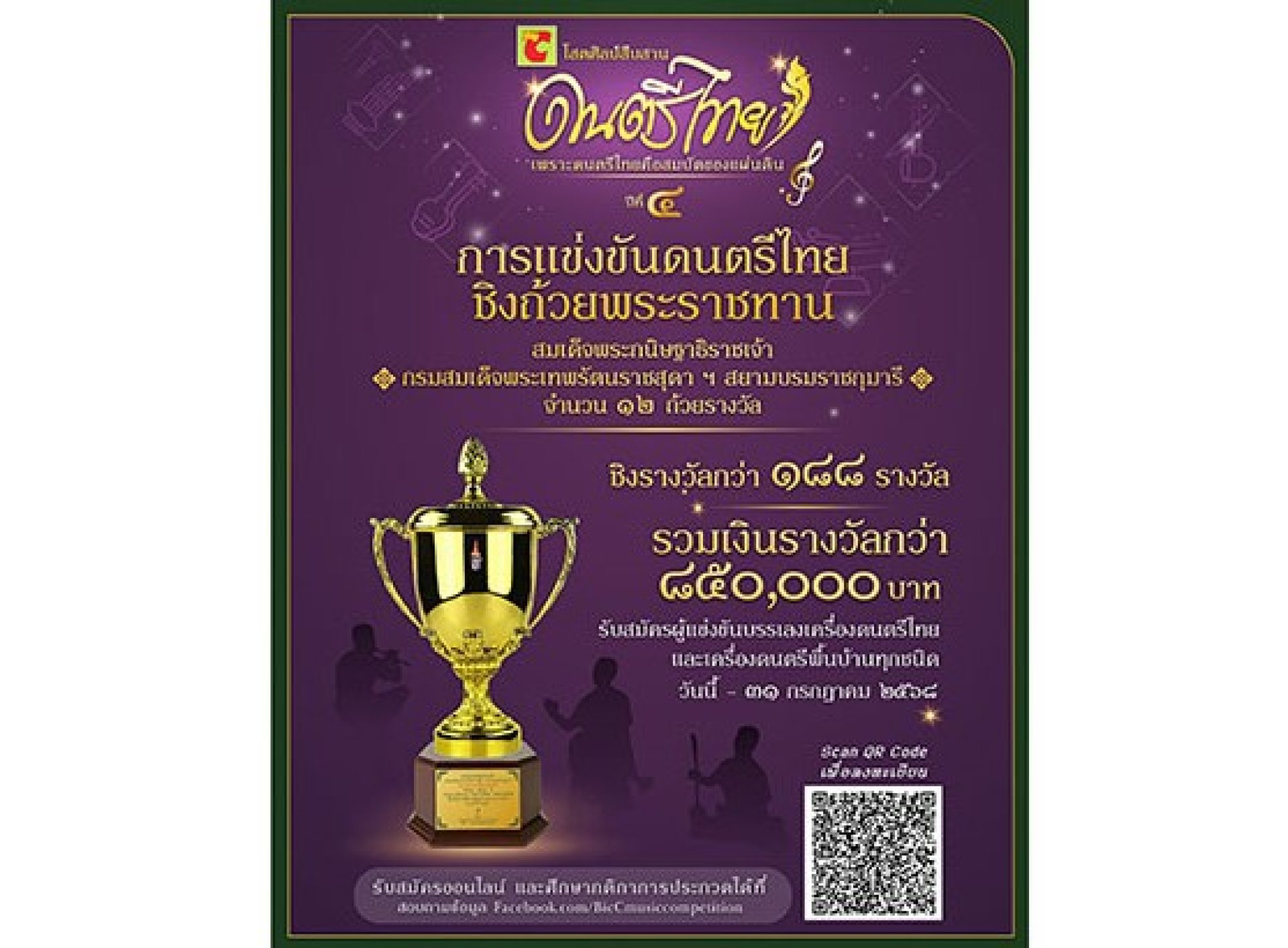 ขอเชิญร่วมแข่งขันดนตรีไทย ชิงถ้วยพระราชทาน สมเด็จพระกนิษฐาธิราชเจ้า กรมสมเด็จพระเทพรัตนราชสุดา ฯ สยามบรมราชกุมารี จำนวน ๑๒ ถ้วยรางวัล พร้อมทุนการศึกษากว่า ๘๕๐,๐๐๐ บาท ในโครงการ “Big C ดนตรีไทย ปี ๔”