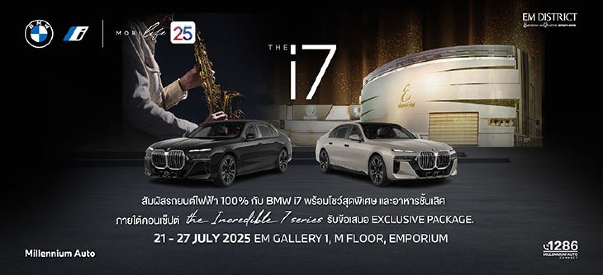 บริษัท มิลเลนเนียม ออโต้ กรุ๊ป จำกัด ผู้จำหน่ายรถยนต์ บีเอ็มดับเบิลยู, มินิ และ มอเตอร์ไซค์ บีเอ็มดับเบิลยู มอเตอร์ราด อย่างเป็นทางการในประเทศไทย ภายใต้ MGC-ASIA ฉลองครบรอบ 25 ปี เดินหน้าจัดประสบการณ์เหนือระดับอย่างต่อเนื่อง เพื่อส่งมอบประสบการณ์สุดเอ็กซ์คลูซีฟให้กับสมาชิกบัตร Platinum M Card โดยร่วมมือกับ EM DISRICT เนรมิตพื้นที่ศูนย์การค้า EMPORIUM จัดแสดงยนตรกรรมอัลตราลักชัวรีระดับแฟลกชิป BMW i7 ขับเคลื่อนด้วยไฟฟ้า 100% ภายใต้คอนเซปต์ The i7: The Incredible 7 Series พร้อมกิจกรรมพิเศษ รวมถึงข้อเสนอที่ยากจะปฏิเสธ ระหว่างวันที่ 21-27 กรกฎาคม 2568 ณ EM Gallery 1 ชั้น M หรือรับสิทธิพิเศษสำหรับยนตรกรรม บีเอ็มดับเบิลยู ทุกรุ่น ได้ที่โชว์รูม บีเอ็มดับเบิลยู ทุกสาขาทั่วประเทศ