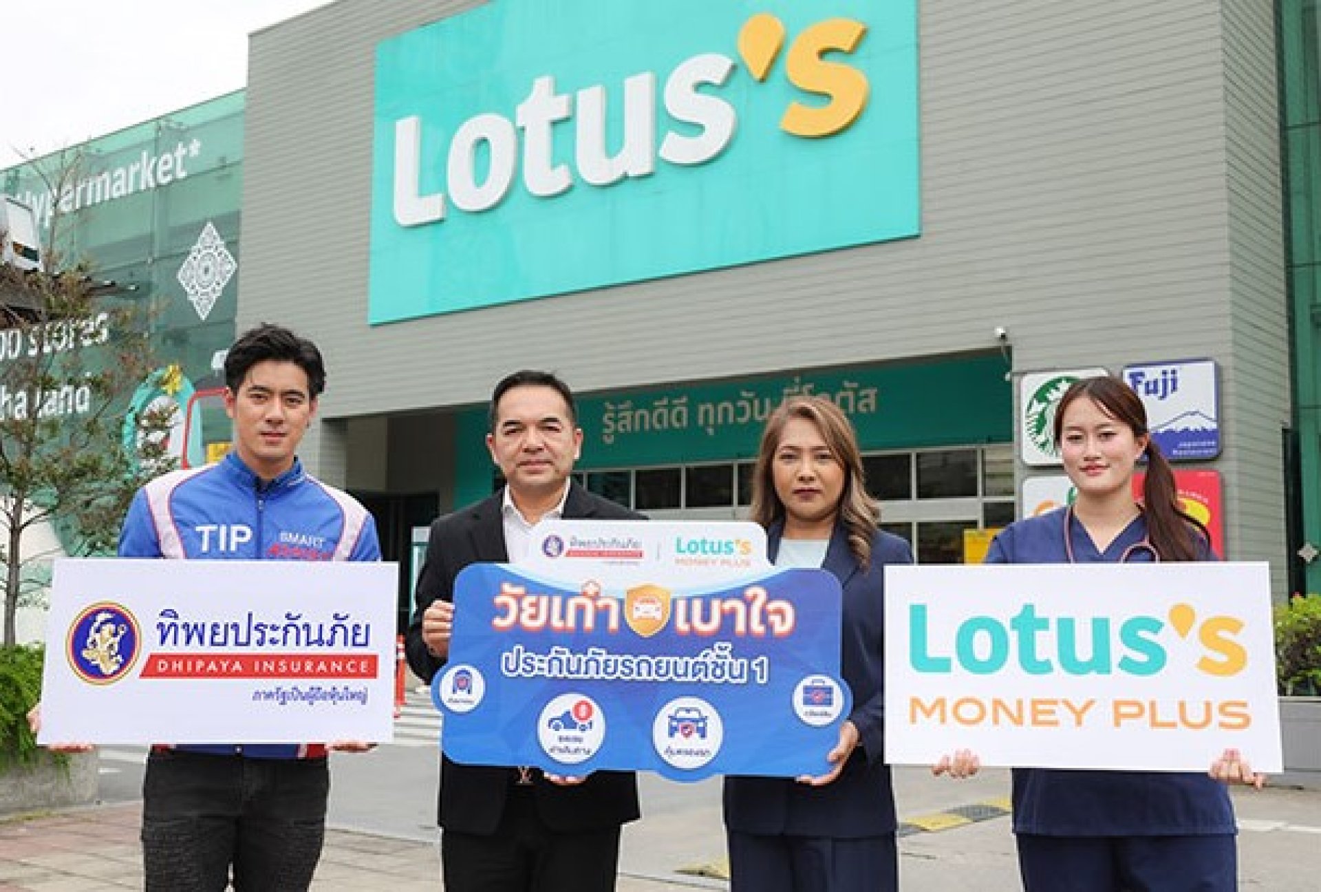 คุณไชยพร จันทรเดช ผู้ช่วยกรรมการผู้จัดการใหญ่ หน่วยธุรกิจประกันภัยรถยนต์ และคุณสุชัญญา กีรติยุติ ผู้อำนวยการฝ่ายขายประกันภัยรถยนต์ บริษัท ทิพยประกันภัย จำกัด (มหาชน) จับมือกับ คุณกาญจนาพร ศรีโมรา ผู้อำนวยการอาวุโสฝ่ายประกันภัย และคุณอังสณา งดงามจรัส ผู้อำนวยการฝ่ายประกันภัยรถยนต์ โลตัส มันนี่ พลัส ผู้ให้บริการด้านบัตรเครดิต สินเชื่อส่วนบุคคล และนายหน้าประกันภัย ภายใต้ บริษัท โลตัสส์ เจเนอรัล อินชัวรันส์ โบรคเกอร์ จำกัด ร่วมเปิดตัว ประกันภัยวัยเก๋าเบาใจ ประกันภัยรถยนต์ชั้น 1 สำหรับกลุ่มผู้สูงอายุวัย 50 75 ปี ที่ต้องการความอุ่นใจและทุกการเดินทาง