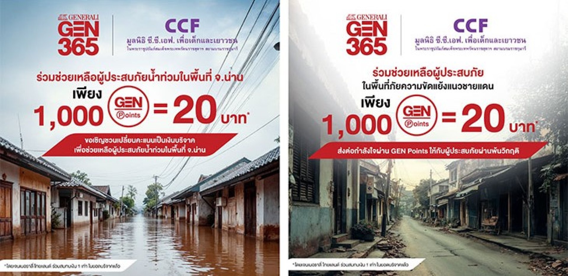 เจนเนอราลี่ ไทยแลนด์ ผนึกกำลัง มูลนิธิ ซี.ซี.เอฟ เพื่อเด็กและเยาวชน เดินหน้าช่วยเหลือผู้ประสบภัยน้ำท่วมในพื้นที่จังหวัดน่าน และผู้ได้รับผลกระทบจากสถานการณ์ความขัดแย้งในพื้นที่แนวชายแดน ชวนลูกค้าเจนเนอราลี่ ไทยแลนด์ มาร่วมเป็นส่วนหนึ่งในการส่งต่อความห่วงใย ด้วยการเปลี่ยนคะแนนสะสม GEN Points ผ่านแอปพลิเคชัน GEN 365 เป็นเงินบริจาค