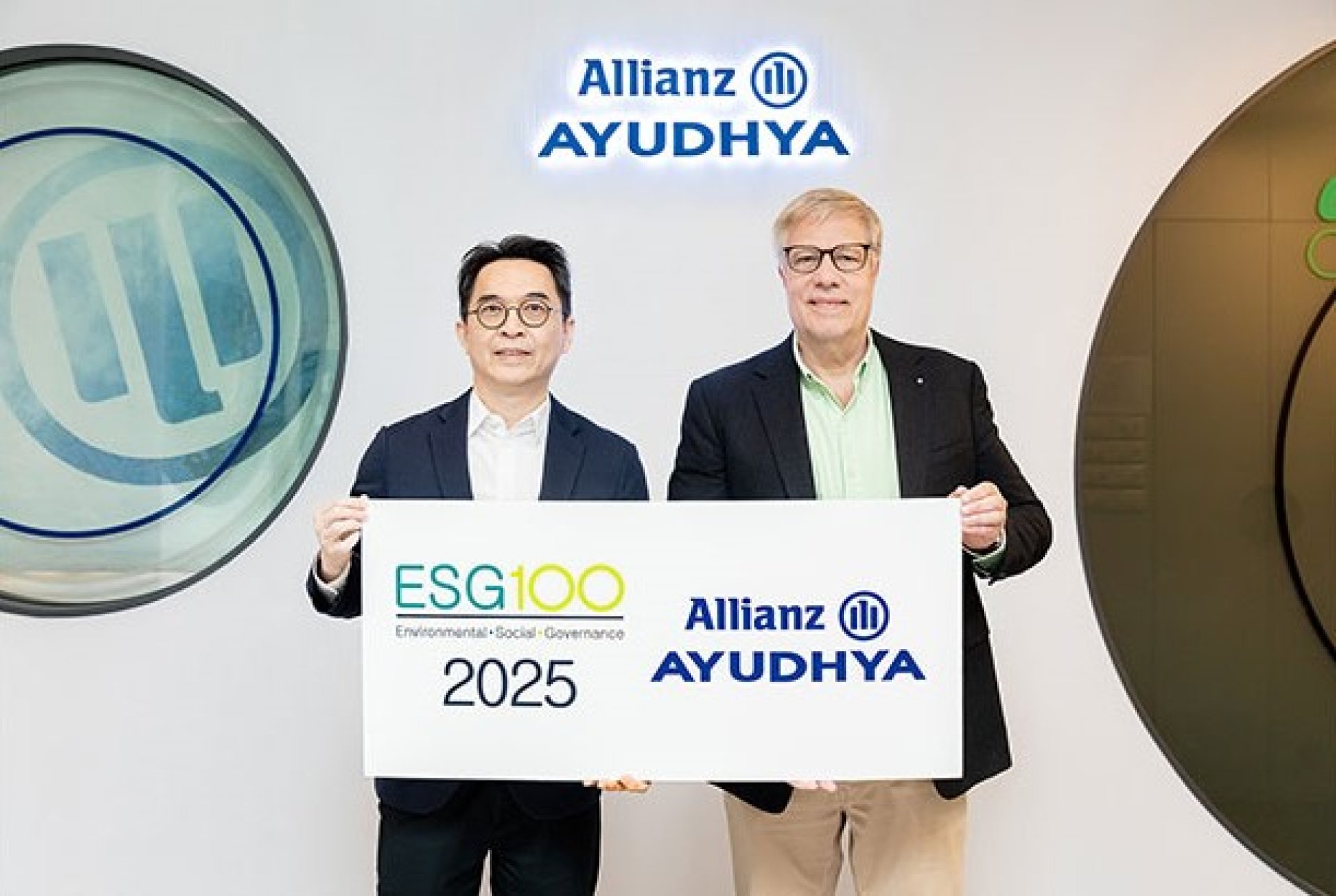 นายโทมัส วิลสัน (ขวา) กรรมการผู้อำนวยการ และประธานเจ้าหน้าที่บริหาร บริษัท อลิอันซ์ อยุธยา แคปปิตอล จำกัด (มหาชน) (AYUD) รับมอบประกาศนียบัตร ESG100 Company จาก ดร.พิพัฒน์ ยอดพฤติการ (ซ้าย) ประธานสถาบันไทยพัฒน์ ในฐานะบริษัทที่มีการดำเนินงานโดดเด่นด้านสิ่งแวดล้อม สังคม และธรรมาภิบาล (ESG) ประจำปี 2568 โดยคัดเลือกจาก 921 หลักทรัพย์จดทะเบียน ตอกย้ำการดำเนินธุรกิจภายใต้วิสัยทัศน์ เราใส่ใจในวันพรุ่งนี้ (We care for tomorrow) ณ สำนักงานใหญ่ บริษัท อลิอันซ์ อยุธยา อาคารเพลินจิตทาวเวอร์