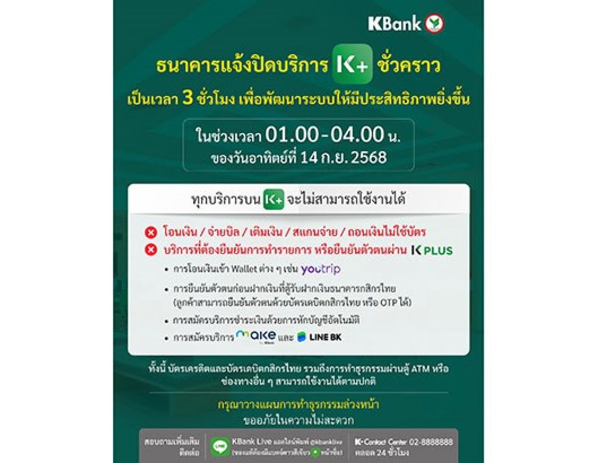 ธนาคารแจ้งปิดบริการ K PLUS ชั่วคราว เป็นเวลา 3 ชั่วโมง เพื่อพัฒนาระบบให้มีประสิทธิภาพยิ่งขึ้น ในวันอาทิตย์ที่ 14 กันยายน 2568 เวลา 01:00 04:00 น. ส่งผลให้ทุกบริการบน K PLUS จะไม่สามารถใช้งานได้ (ไม่สามารถโอนเงิน จ่ายบิล เติมเงิน สแกนจ่าย และถอนเงินไม่ใช้บัตร) รวมถึงบริการที่ต้องยืนยันการทำรายการ หรือยืนยันตัวตนผ่าน K PLUS จะไม่สามารถใช้งานได้ เช่น