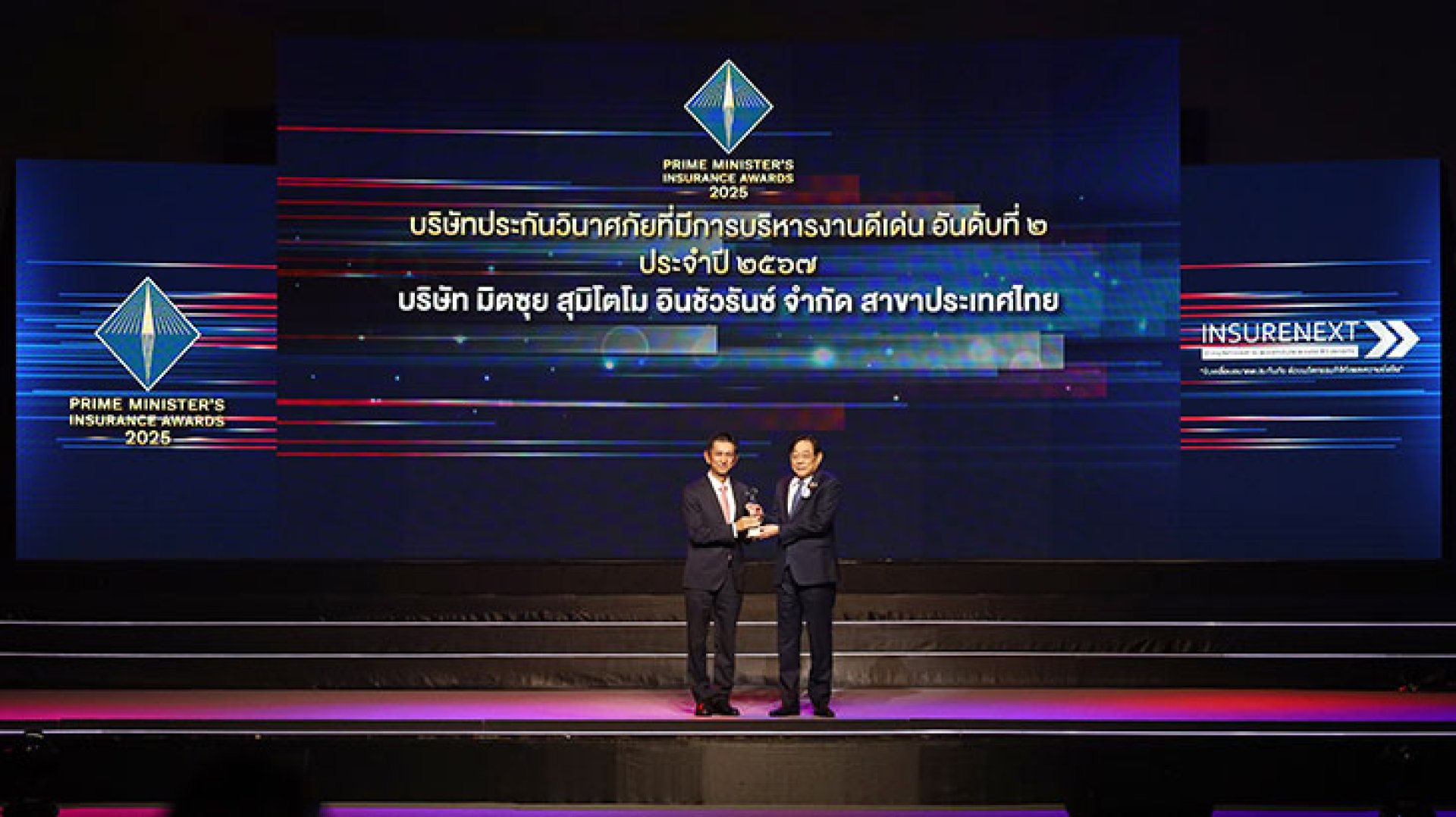 บริษัท มิตซุย สุมิโตโม อินชัวรันซ์ จำกัด สาขาประเทศไทย โดย นายโทะโมะยุคิ โคะมะโกะเมะ ประธานกรรมการบริหาร เข้ารับรางวัลบริษัทประกันวินาศภัยที่มีการบริหารงานดีเด่น อันดับที่ 2 ประจำปี 2567 โดยนายพิชัย ชุณหวชิร รองนายกรัฐมนตรีและรัฐมนตรีว่าการกระทรวงการคลัง ให้เกียรติเป็นประธานมอบรางวัล ในพิธีมอบรางวัลประกันภัยดีเด่นครบวงจร ประจำปี 2568 (Prime Ministers Insurance Awards 2025) นับเป็นปีที่ 8 ติดต่อกันที่บริษัทได้รับรางวัลอันทรงเกียรตินี้ งานจัดขึ้น ณ ห้องบางกอก คอนเวนชันเซ็นเตอร์ เอวัน ชั้น 22 โรงแรมเซ็นทาราแกรนด์ และบางกอกคอนเวนชันเซ็นเตอร์ เซ็นทรัลเวิลด์