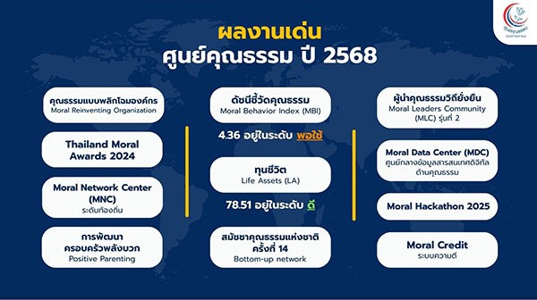 - Moral Network Center (MNC) กลไกประสานความร่วมมือเครือข่ายภาครัฐ เอกชน ศาสนา การศึกษา และประชาสังคม ขยายไปสู่ 12 จังหวัด ได้แก่ เชียงราย ลำปาง แพร่ น่าน กำแพงเพชร อุดรธานี หนองคาย กาฬสินธุ์ พระนครศรีอยุธยา ระยอง พังงา และสุราษฎร์ธานี เป็นเวทีแลกเปลี่ยนเรียนรู้และพัฒนากิจกรรมร่วม พร้อมต่อยอดสู่ยุทธศาสตร์และนโยบายระดับชาติ