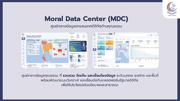 ในขณะเดียวกัน เพื่อส่งเสริมและสร้างการตระหนักรู้ด้านคุณธรรมให้เข้าถึงประชาชนทุกเพศ ทุกวัย อย่างรวดเร็วและหลากหลายช่องทาง ศูนย์คุณธรรมได้นำเทคโนโลยีดิจิทัลด้านคุณธรรม หรือ Moral Digital Platform เป็นสื่อกลาง ครอบคลุมทั้งเว็บไซต์ แอปพลิเคชัน และสื่อสังคมออนไลน์ โดยนำนวัตกรรมคุณธรรมวัดผลได้ "Moral Data Center (MDC") ศูนย์ข้อมูลดิจิทัลคุณธรรม ระบบที่รวบรวม จัดเก็บ และเชื่อมโยงข้อมูลที่เกี่ยวข้องกับดัชนีชี้วัดคุณธรรม องค์กร ชุมชน บุคคล องค์ความรู้ และเครื่องมือส่งเสริมคุณธรรม การขยายชุดข้อมูลให้ครอบคลุมทุกมิติ การพัฒนาเครื่องมือวิเคราะห์และเชื่อมโยงกับระบบ Open Government Data และระบบศูนย์แลกเปลี่ยนข้อมูลกลาง (Government Data Exchange: GDX)
