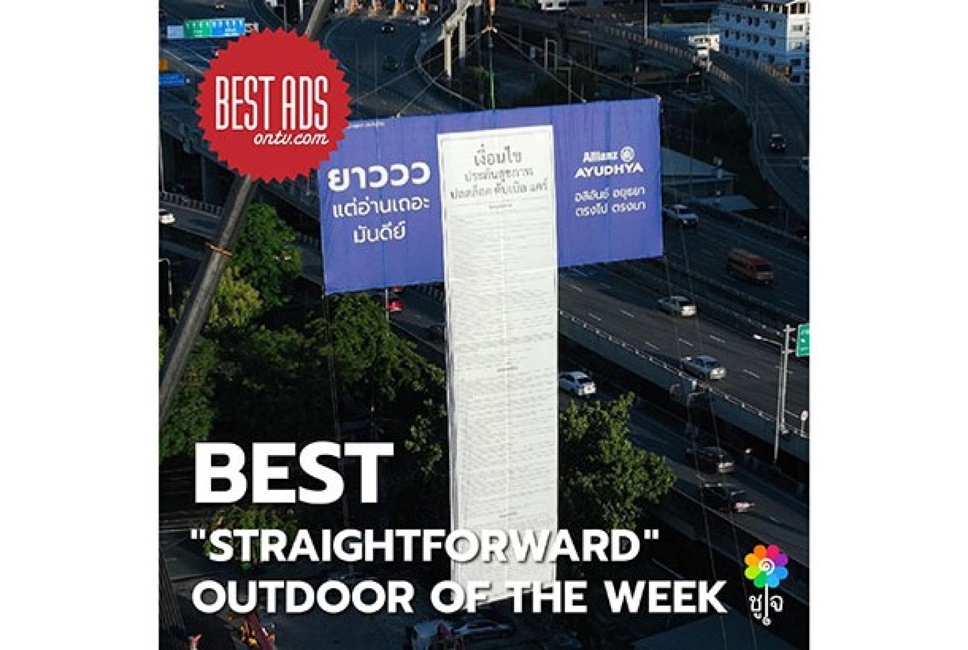 แคมเปญ ตรงไปตรงมา (Straightforward) ของ บมจ. อลิอันซ์ อยุธยา ประกันชีวิต ถูกออกแบบเพื่อกระตุ้นให้ผู้บริโภคเห็นถึงความสำคัญของการอ่านและเข้าใจเงื่อนไขประกันก่อนตัดสินใจซื้อ ตอบโจทย์ปัญหาที่วงการมักสื่อสารเพียงผลประโยชน์คุ้มครองจนผู้บริโภครู้สึกถูกเอาเปรียบเมื่อเคลมจริง แคมเปญนี้พลิกเกมด้วยการนำ เงื่อนไขประกัน มาขึ้นบิลบอร์ดยักษ์ริมทางด่วน ใช้เครนยกขึ้นฟ้า พร้อมข้อความกระแทกใจ ยาววว แต่อ่านเถอะ มันดีย์ แสดงจุดยืนแบรนด์ที่กล้าหาญ โปร่งใส และแตกต่าง จนสามารถคว้ารางวัล Best Outdoor Ads จาก Best Ads onTV.com