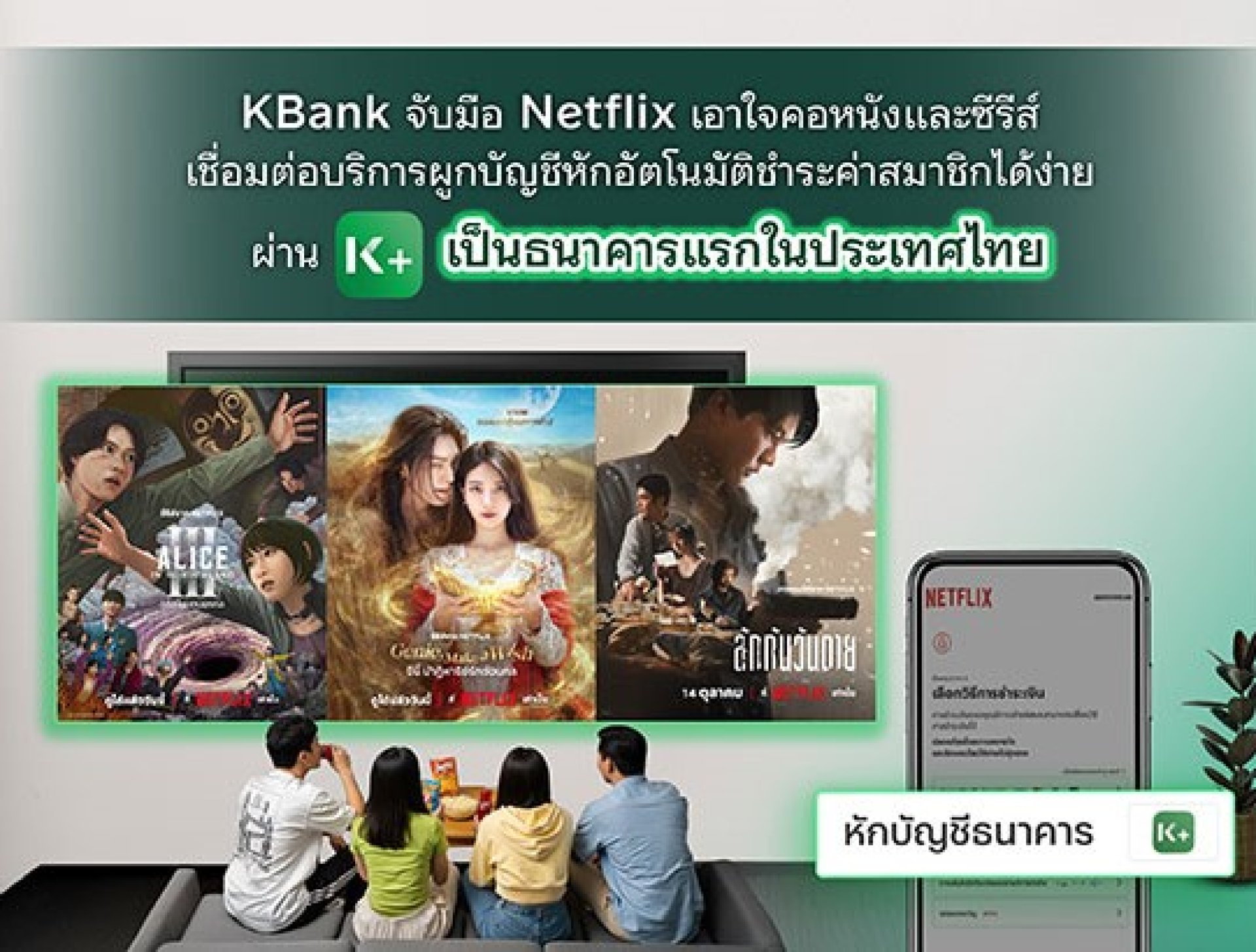 KBank จับมือ Netflix เอาใจคอหนังและซีรีส์ เชื่อมต่อบริการผูกบัญชีหักอัตโนมัติชำระค่าสมาชิกได้ง่ายผ่าน K PLUS เป็นธนาคารแรกในประเทศไทย