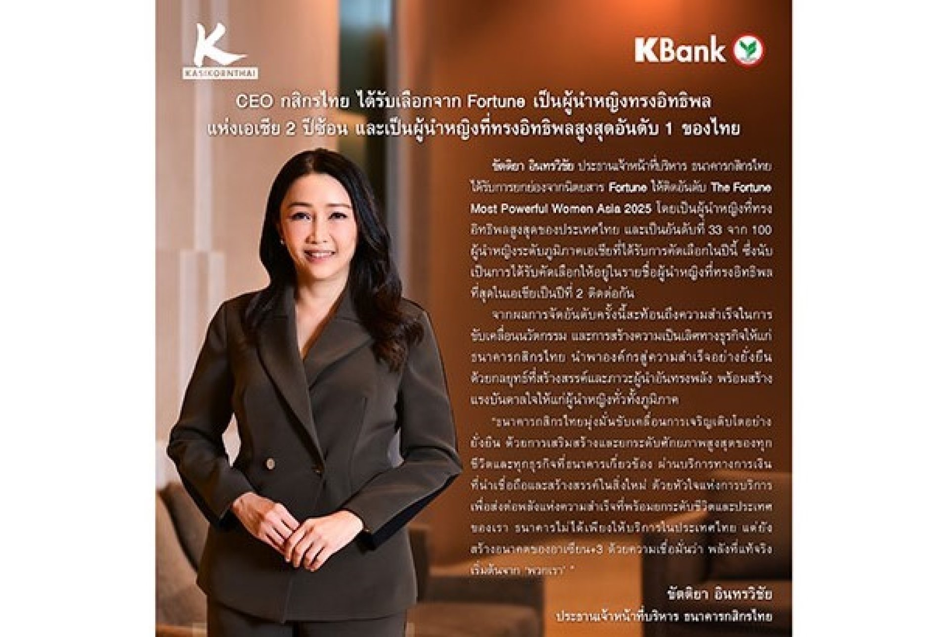 ขัตติยา อินทรวิชัย ประธานเจ้าหน้าที่บริหาร ธนาคารกสิกรไทย ได้รับการยกย่องจากนิตยสาร Fortune ให้ติดอันดับ The Fortune Most Powerful Women Asia 2025 โดยเป็นผู้นำหญิงที่ทรงอิทธิพลสูงสุดอันดับ 1 ของประเทศไทย และเป็นอันดับที่ 33 จาก 100 ผู้นำหญิงทรงอิทธิพลของภูมิภาคเอเชียที่ได้รับการคัดเลือกในปีนี้ ซึ่งเป็นการได้รับคัดเลือกให้อยู่ในรายชื่อผู้นำหญิงที่ทรงอิทธิพลที่สุดในเอเชียเป็นปีที่ 2 ติดต่อกัน